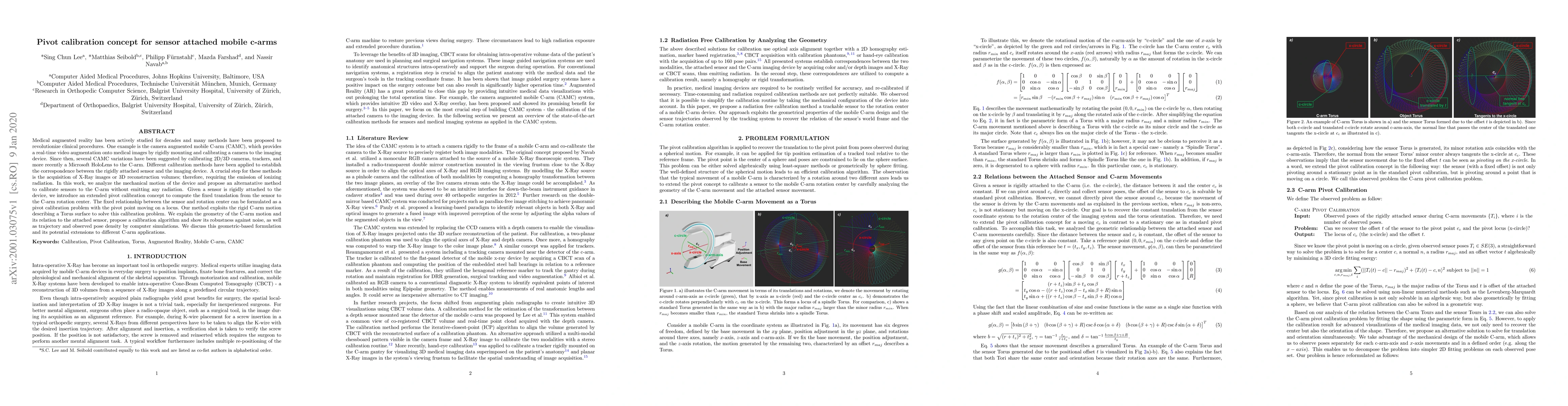 Medical augmented reality has been actively studied for decades and many methods have been proposed torevolutionize clinical procedures. One example is the camera augmented mobile C-arm (CAMC), which providesa real-time video augmentation onto medical images by rigidly mounting and calibrating a camera to the imagingdevice. Since then, several CAMC variations have been suggested by calibrating 2D/3D cameras, trackers, andmore recently a Microsoft HoloLens to the C-arm. Different calibration methods have been applied to establishthe correspondence between the rigidly attached sensor and the imaging device. A crucial step for these methodsis the acquisition of X-Ray images or 3D reconstruction volumes; therefore, requiring the emission of ionizingradiation. In this work, we analyze the mechanical motion of the device and propose an alternatative methodto calibrate sensors to the C-arm without emitting any radiation. Given a sensor is rigidly attached to thedevice, we introduce an extended pivot calibration concept to compute the fixed translation from the sensor tothe C-arm rotation center. The fixed relationship between the sensor and rotation center can be formulated as apivot calibration problem with the pivot point moving on a locus. Our method exploits the rigid C-arm motiondescribing a Torus surface to solve this calibration problem. We explain the geometry of the C-arm motion andits relation to the attached sensor, propose a calibration algorithm and show its robustness against noise, as wellas trajectory and observed pose density by computer simulations. We discuss this geometric-based formulationand its potential extensions to different C-arm applications.