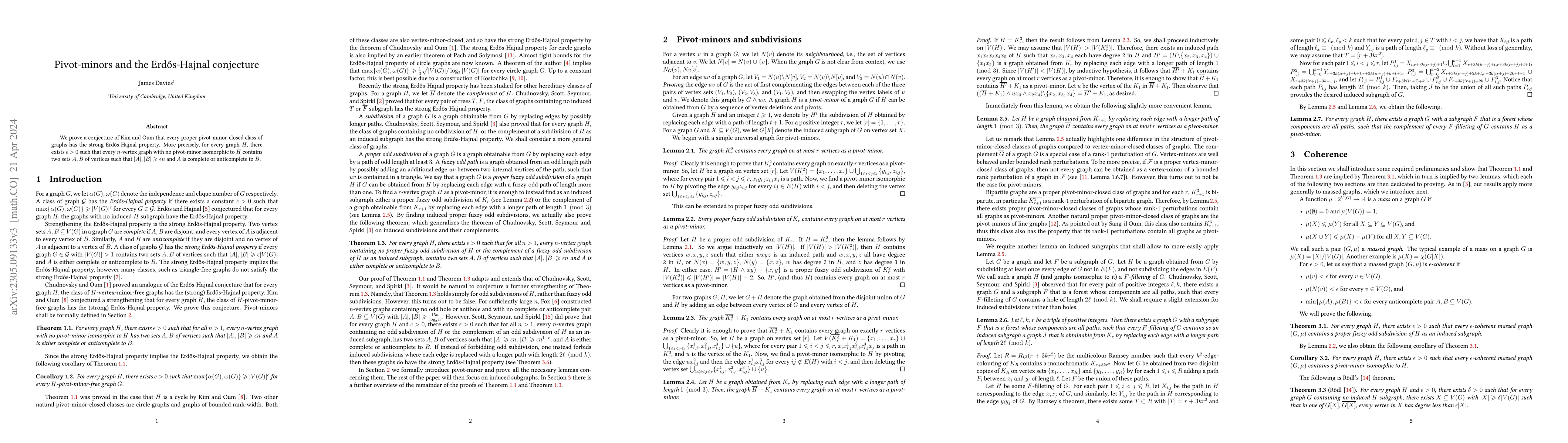 We prove a conjecture of Kim and Oum that every proper pivot-minor-closed class of graphs has the strong Erd\H{o}s-Hajnal property. More precisely, for every graph $H$, there exists $\epsilon > 0$ such that every $n$-vertex graph with no pivot-minor isomorphic to $H$ contains two sets $A, B$ of vertices such that $|A|, |B| \ge \epsilon n$ and $A$ is complete or anticomplete to $B$.