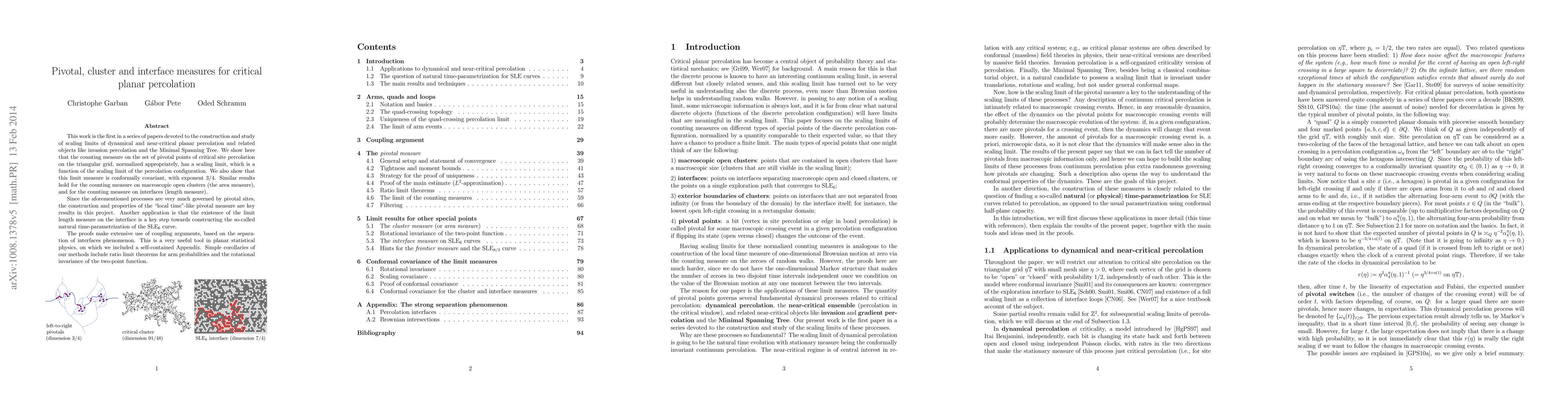 This work is the first in a series of papers devoted to the construction and study of scaling limits of dynamical and near-critical planar percolation and related objects like invasion percolation and the Minimal Spanning Tree. We show here that the counting measure on the set of pivotal points of critical site percolation on the triangular grid, normalized appropriately, has a scaling limit, which is a function of the scaling limit of the percolation configuration. We also show that this limit measure is conformally covariant, with exponent 3/4. Similar results hold for the counting measure on macroscopic open clusters (the area measure), and for the counting measure on interfaces (length measure). Since the aforementioned processes are very much governed by pivotal sites, the construction and properties of the "local time"-like pivotal measure are key results in this project. Another application is that the existence of the limit length measure on the interface is a key step towards constructing the so-called natural time-parametrization of the SLE(6) curve. The proofs make extensive use of coupling arguments, based on the separation of interfaces phenomenon. This is a very useful tool in planar statistical physics, on which we included a self-contained Appendix. Simple corollaries of our methods include ratio limit theorems for arm probabilities and the rotational invariance of the two-point function.