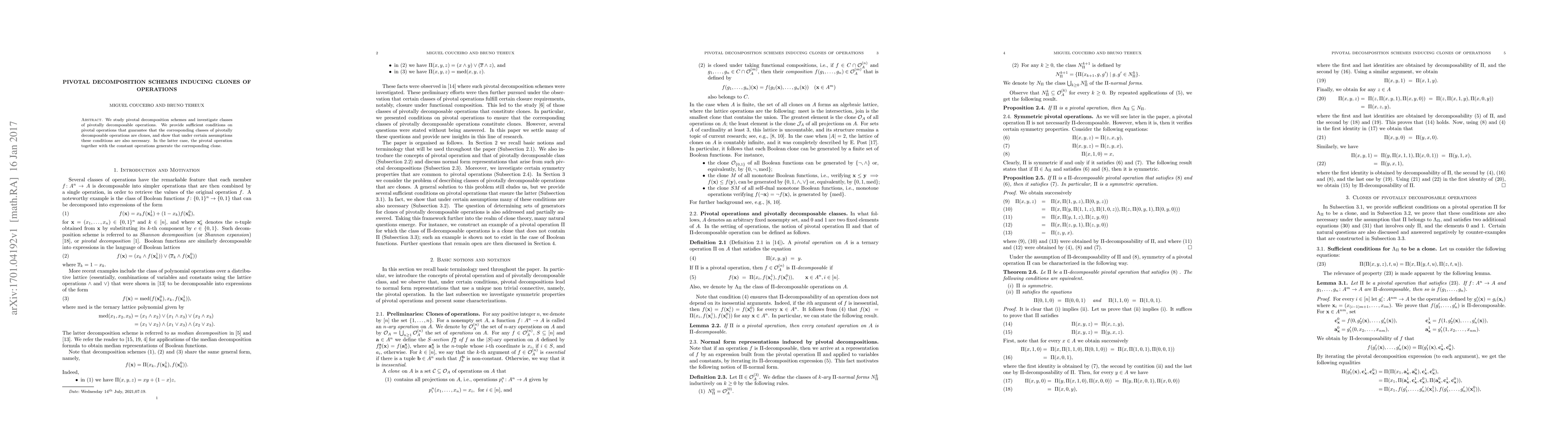 This paper explores pivotal decomposition schemes and identifies classes of pivotally decomposable operations. It establishes sufficient and necessary conditions for pivotal operations to generate clones, demonstrating that under specific assumptions, the pivotal operation and constant operations together form the clone.