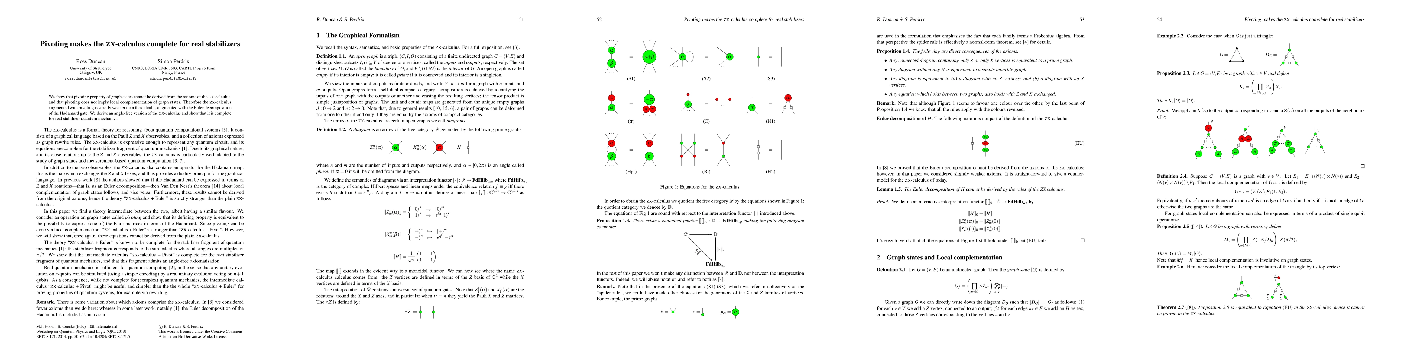 We show that pivoting property of graph states cannot be derived from the axioms of the ZX-calculus, and that pivoting does not imply local complementation of graph states. Therefore the ZX-calculus augmented with pivoting is strictly weaker than the calculus augmented with the Euler decomposition of the Hadamard gate. We derive an angle-free version of the ZX-calculus and show that it is complete for real stabilizer quantum mechanics.