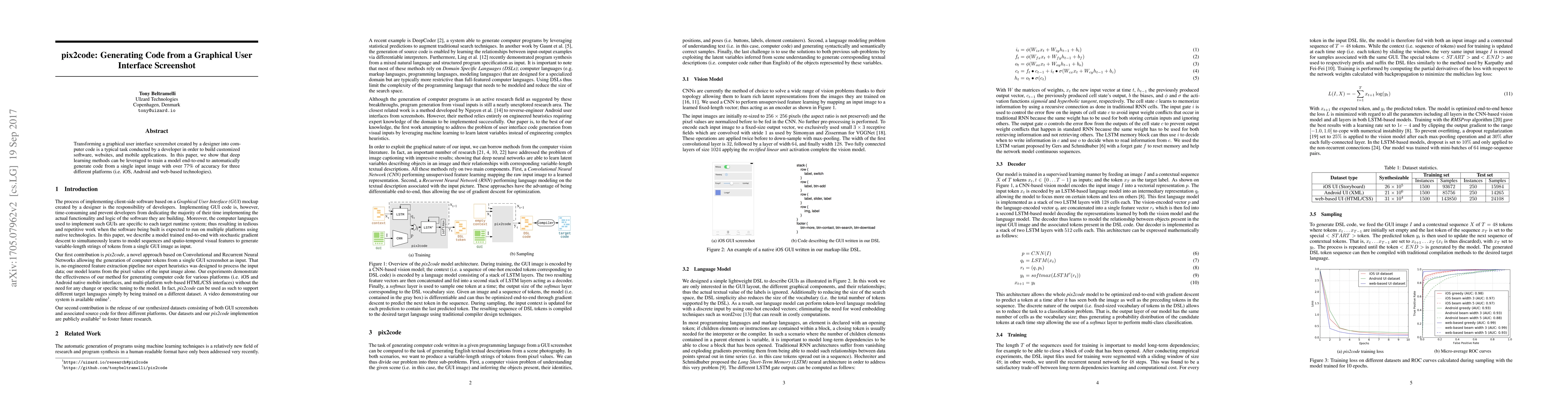 This paper presents pix2code, a deep learning model that generates code from GUI screenshots with over 77% accuracy for iOS, Android, and web platforms. It automates the task typically done by developers, potentially revolutionizing software development.