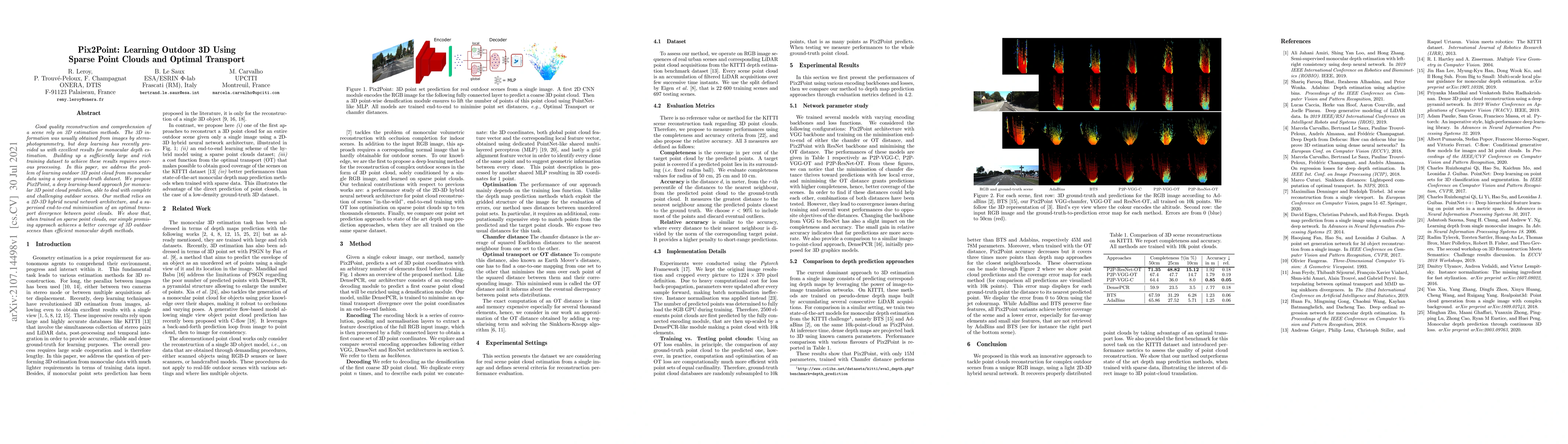Pix2Point proposes a deep learning method for predicting sparse 3D outdoor point clouds from monocular images, utilizing a hybrid neural network and optimal transport divergence. The approach achieves better coverage of complex outdoor scenes compared to traditional monocular depth estimation methods.