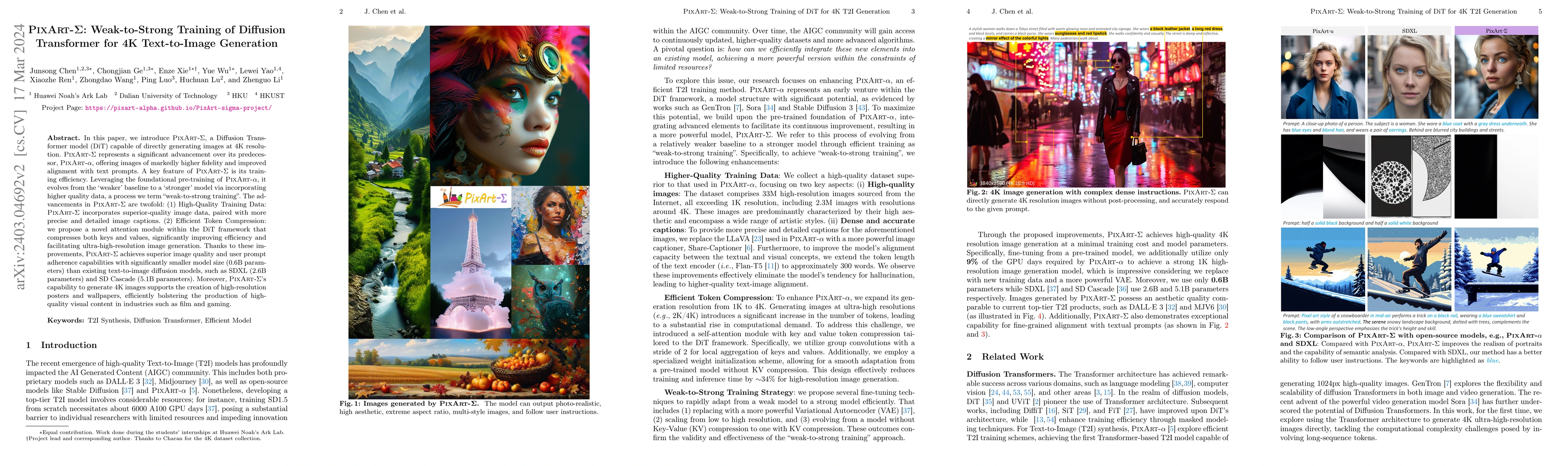 PixArt-\Sigma is a Diffusion Transformer model that generates 4K images with high fidelity and efficiency. It employs "weak-to-strong training" to evolve from a weaker baseline, using superior training data and an innovative attention module for token compression, resulting in a smaller model size while maintaining high-quality image generation.