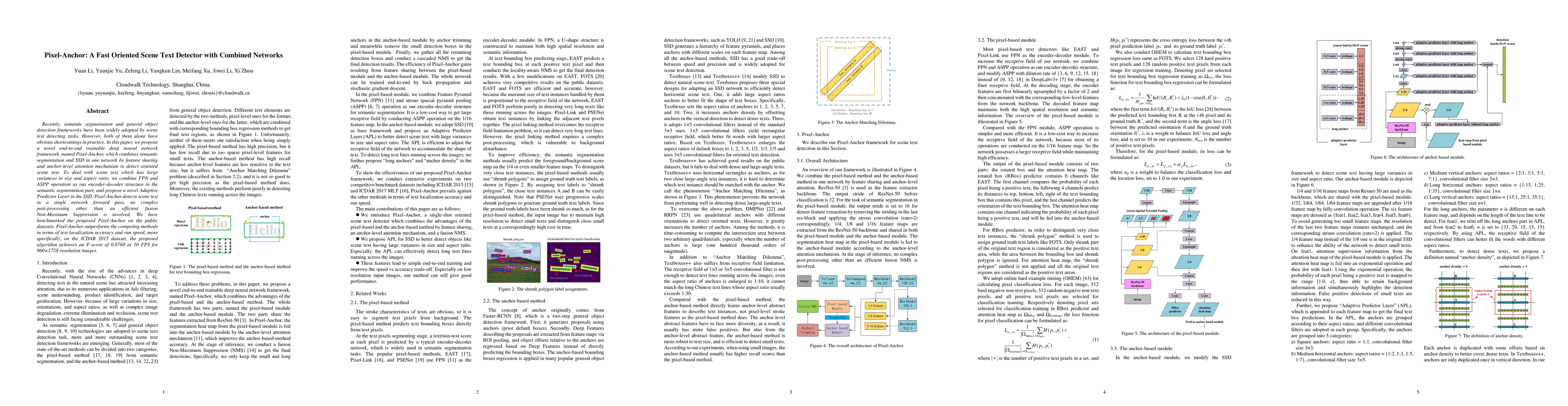 Pixel-Anchor integrates semantic segmentation and SSD with feature sharing and an anchor-level attention mechanism for fast and accurate oriented scene text detection, achieving high F-score and speed on public datasets.