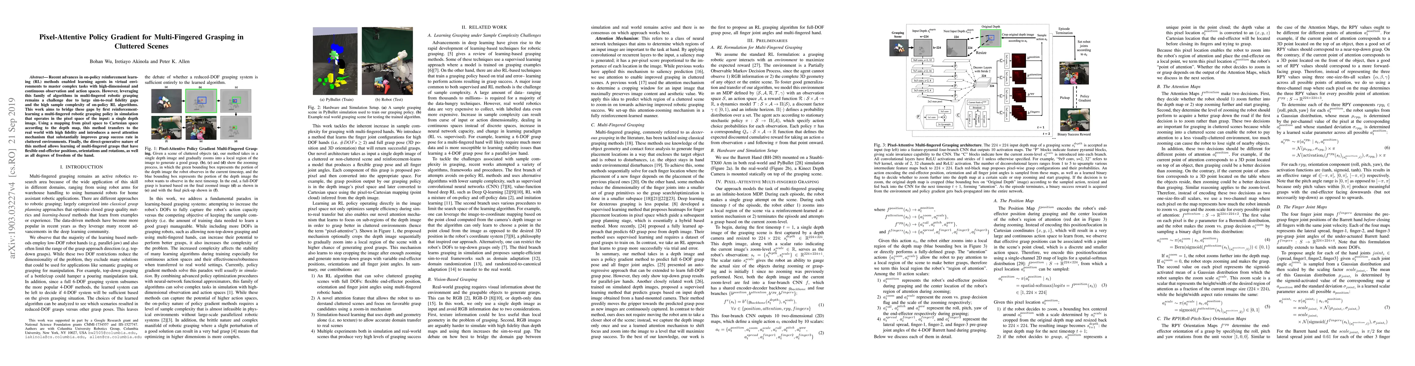 This paper proposes a pixel-attentive policy gradient method for multi-fingered robotic grasping in cluttered scenes, leveraging reinforcement learning to bridge sim-to-real gaps. It introduces an attention mechanism to enhance grasp success rates and allows flexible learning of hand and end-effector configurations.