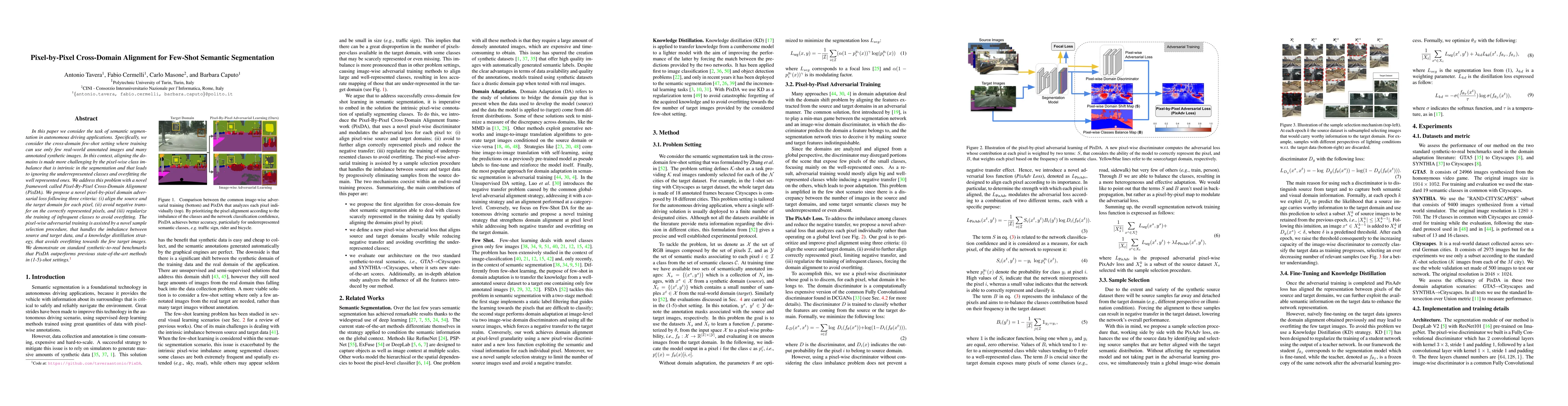 This paper introduces PixDA, a novel framework for few-shot semantic segmentation in autonomous driving, addressing domain alignment and pixel-wise class imbalance. It employs a pixel-by-pixel domain adversarial loss and a sample selection method to outperform previous methods on synthetic-to-real benchmarks.