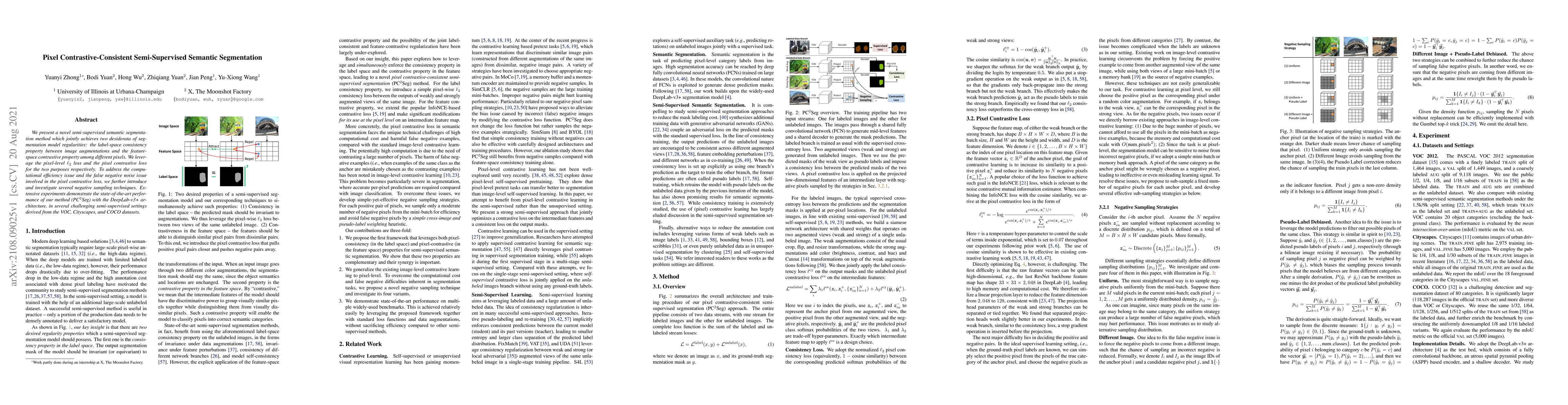 This paper introduces PC2Seg, a semi-supervised semantic segmentation method that enforces label-space consistency and feature-space contrastivity through pixel-level losses. It addresses computational efficiency and noise issues with negative sampling techniques, achieving state-of-the-art results on VOC, Cityscapes, and COCO datasets.