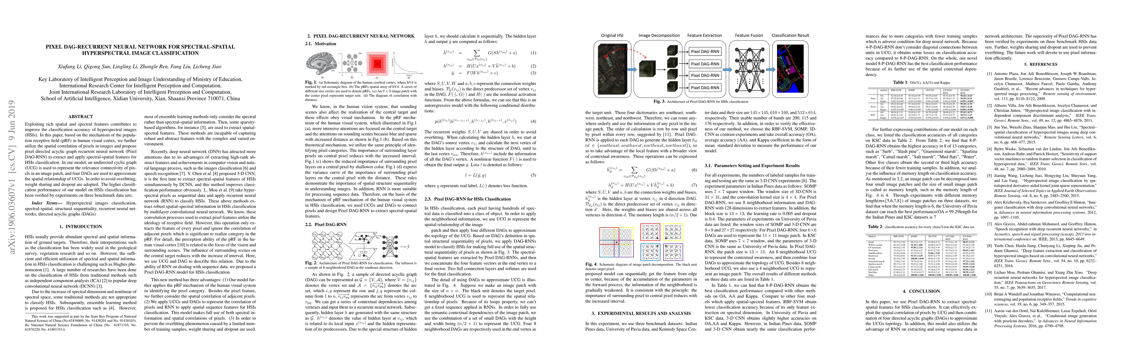 This paper proposes a Pixel DAG-Recurrent Neural Network (Pixel DAG-RNN) to enhance hyperspectral image classification by leveraging spectral-spatial features. The model uses an undirected cyclic graph to represent pixel relevance and four directed acyclic graphs to approximate spatial relationships, achieving higher classification accuracy on benchmark datasets.