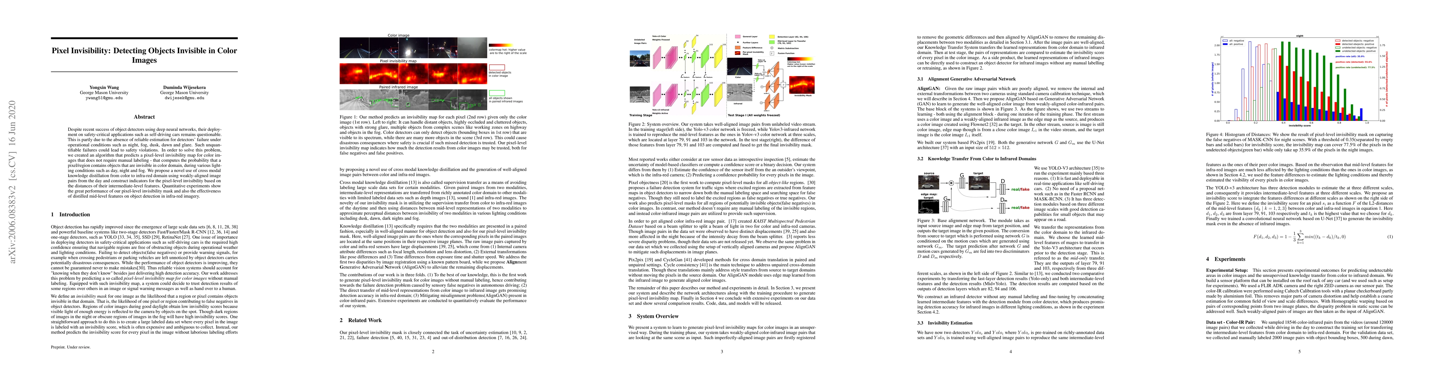 Despite recent success of object detectors using deep neural networks, their deployment on safety-critical applications such as self-driving cars remains questionable. This is partly due to the absence of reliable estimation for detectors' failure under operational conditions such as night, fog, dusk, dawn and glare. Such unquantifiable failures could lead to safety violations. In order to solve this problem, we created an algorithm that predicts a pixel-level invisibility map for color images that does not require manual labeling - that computes the probability that a pixel/region contains objects that are invisible in color domain, during various lighting conditions such as day, night and fog. We propose a novel use of cross modal knowledge distillation from color to infra-red domain using weakly-aligned image pairs from the day and construct indicators for the pixel-level invisibility based on the distances of their intermediate-level features. Quantitative experiments show the great performance of our pixel-level invisibility mask and also the effectiveness of distilled mid-level features on object detection in infra-red imagery.