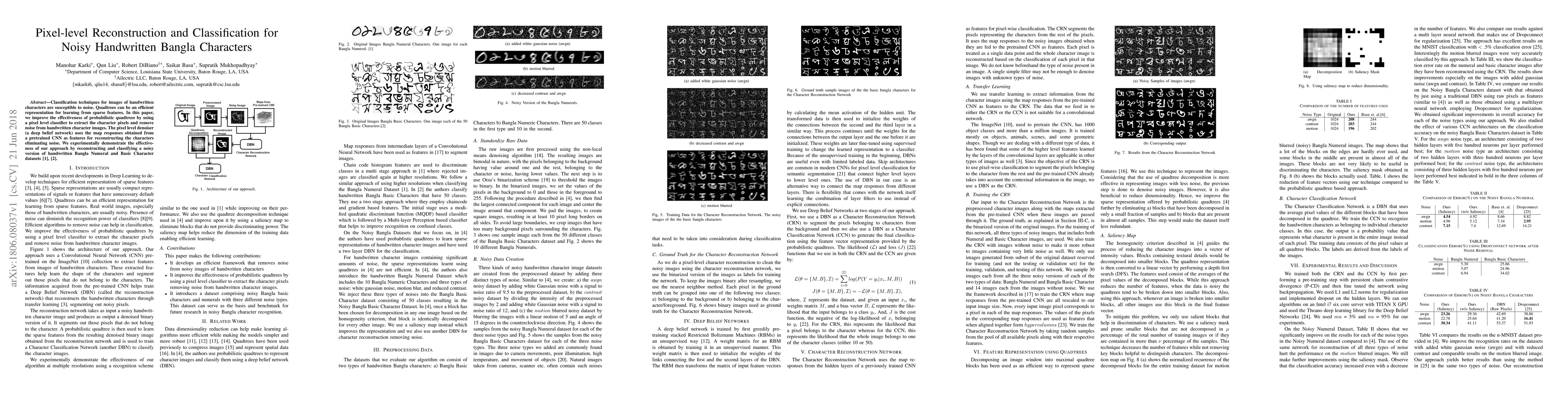 This paper proposes a method to reconstruct and classify noisy handwritten Bangla characters using probabilistic quadtrees enhanced by a pixel-level deep belief network denoiser, which leverages features from a pretrained CNN for noise removal and character reconstruction. Experimental results show improved performance on Bangla Numeral and Basic Character datasets.