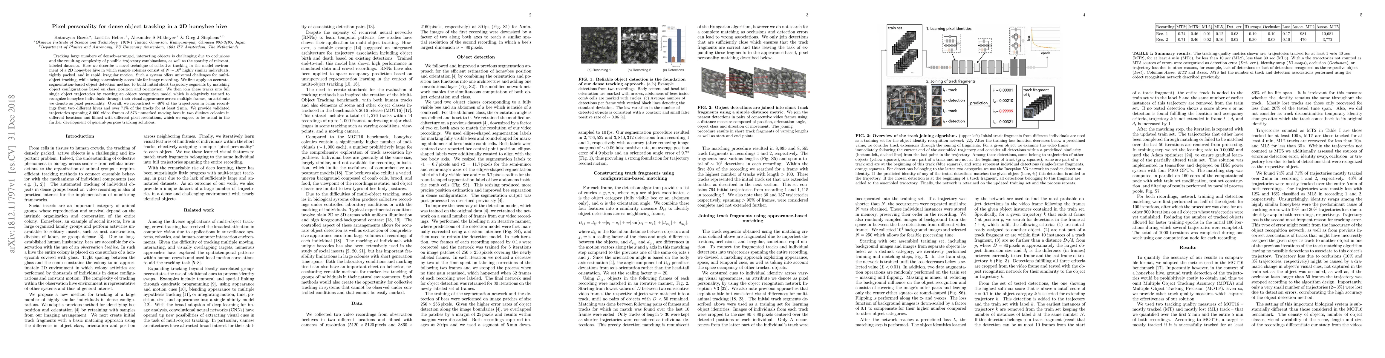 Tracking large numbers of densely-arranged, interacting objects is challenging due to occlusions and the resulting complexity of possible trajectory combinations, as well as the sparsity of relevant, labeled datasets. Here we describe a novel technique of collective tracking in the model environment of a 2D honeybee hive in which sample colonies consist of $N\sim10^3$ highly similar individuals, tightly packed, and in rapid, irregular motion. Such a system offers universal challenges for multi-object tracking, while being conveniently accessible for image recording. We first apply an accurate, segmentation-based object detection method to build initial short trajectory segments by matching object configurations based on class, position and orientation. We then join these tracks into full single object trajectories by creating an object recognition model which is adaptively trained to recognize honeybee individuals through their visual appearance across multiple frames, an attribute we denote as pixel personality. Overall, we reconstruct ~46% of the trajectories in 5 min recordings from two different hives and over 71% of the tracks for at least 2 min. We provide validated trajectories spanning 3000 video frames of 876 unmarked moving bees in two distinct colonies in different locations and filmed with different pixel resolutions, which we expect to be useful in the further development of general-purpose tracking solutions.