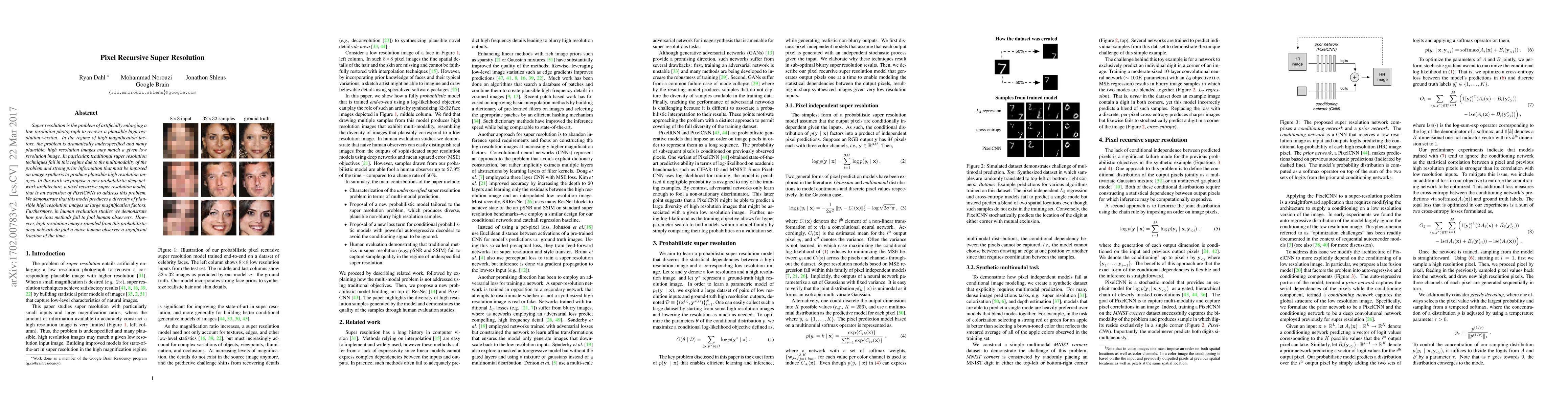 This paper introduces a pixel recursive super resolution model that enhances image resolution by synthesizing realistic details, addressing the issue of blurry edges caused by averaging details in traditional methods. It uses a PixelCNN architecture to model statistical dependencies among high resolution pixels, achieving more photo-realistic results compared to a baseline L2 regression model.
