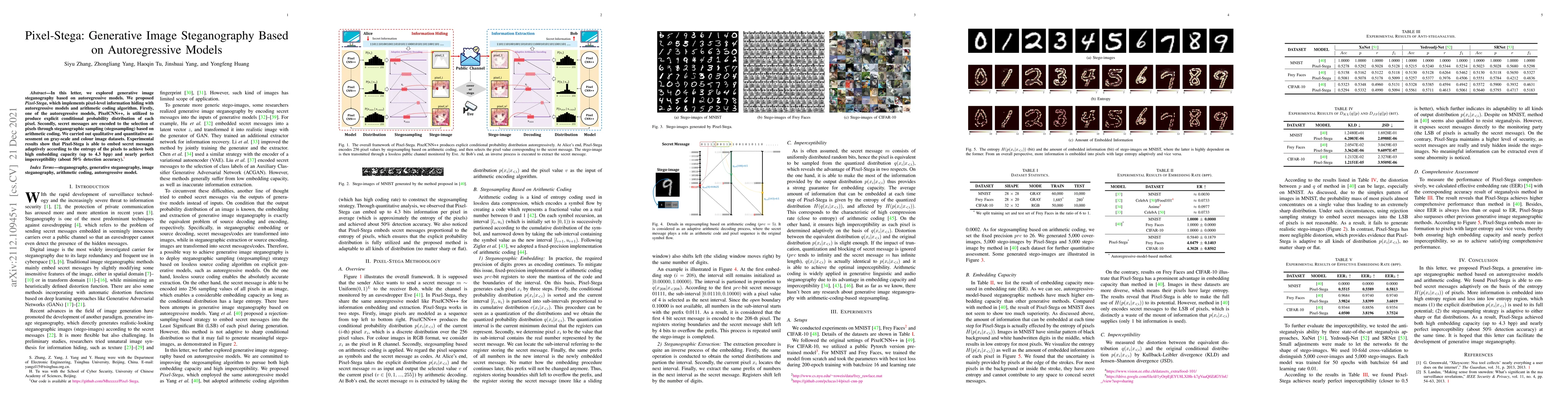 Pixel-Stega employs autoregressive models, specifically PixelCNN++, to generate conditional pixel distributions for steganographically embedding secret messages using stegosampling and arithmetic coding. The method achieves high embedding capacity and maintains near-perfect imperceptibility in both grayscale and color images.
