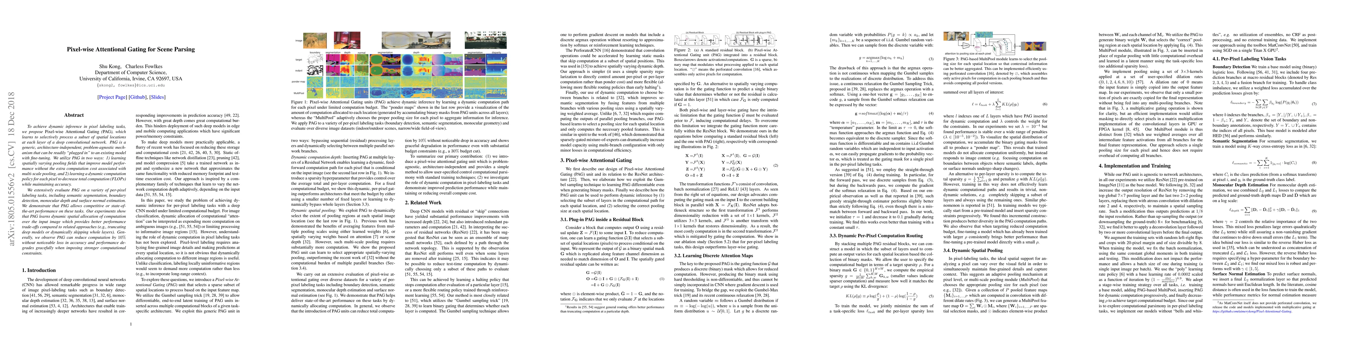 To achieve parsimonious inference in per-pixel labeling tasks with a limited computational budget, we propose a \emph{Pixel-wise Attentional Gating} unit (\emph{PAG}) that learns to selectively process a subset of spatial locations at each layer of a deep convolutional network. PAG is a generic, architecture-independent, problem-agnostic mechanism that can be readily "plugged in" to an existing model with fine-tuning. We utilize PAG in two ways: 1) learning spatially varying pooling fields that improve model performance without the extra computation cost associated with multi-scale pooling, and 2) learning a dynamic computation policy for each pixel to decrease total computation while maintaining accuracy. We extensively evaluate PAG on a variety of per-pixel labeling tasks, including semantic segmentation, boundary detection, monocular depth and surface normal estimation. We demonstrate that PAG allows competitive or state-of-the-art performance on these tasks. Our experiments show that PAG learns dynamic spatial allocation of computation over the input image which provides better performance trade-offs compared to related approaches (e.g., truncating deep models or dynamically skipping whole layers). Generally, we observe PAG can reduce computation by $10\%$ without noticeable loss in accuracy and performance degrades gracefully when imposing stronger computational constraints.