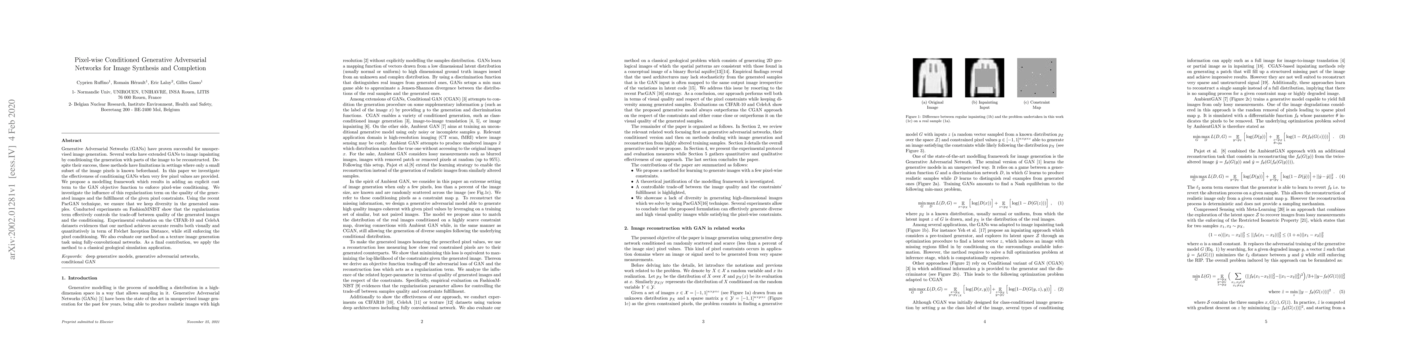 This paper proposes a pixel-wise conditioned GAN framework that adds an explicit cost term to enforce conditioning with minimal known pixel values, achieving high-quality image synthesis and completion. Experiments on FashionMNIST, CIFAR-10, and CelebA demonstrate the method's effectiveness in maintaining pixel constraints while generating diverse and accurate results.