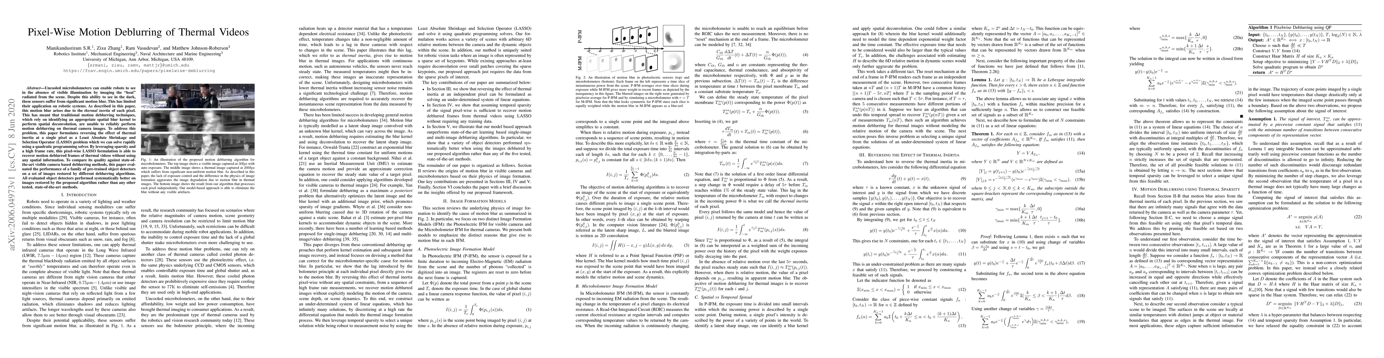 Uncooled microbolometers can enable robots to see in the absence of visible illumination by imaging the "heat" radiated from the scene. Despite this ability to see in the dark, these sensors suffer from significant motion blur. This has limited their application on robotic systems. As described in this paper, this motion blur arises due to the thermal inertia of each pixel. This has meant that traditional motion deblurring techniques, which rely on identifying an appropriate spatial blur kernel to perform spatial deconvolution, are unable to reliably perform motion deblurring on thermal camera images. To address this problem, this paper formulates reversing the effect of thermal inertia at a single pixel as a Least Absolute Shrinkage and Selection Operator (LASSO) problem which we can solve rapidly using a quadratic programming solver. By leveraging sparsity and a high frame rate, this pixel-wise LASSO formulation is able to recover motion deblurred frames of thermal videos without using any spatial information. To compare its quality against state-of-the-art visible camera based deblurring methods, this paper evaluated the performance of a family of pre-trained object detectors on a set of images restored by different deblurring algorithms. All evaluated object detectors performed systematically better on images restored by the proposed algorithm rather than any other tested, state-of-the-art methods.