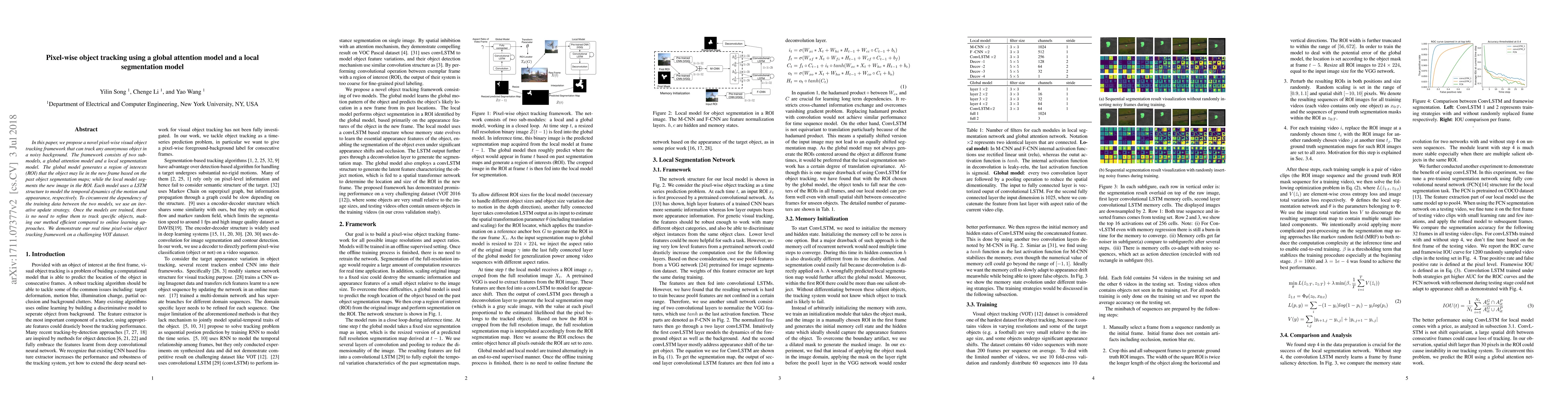 This paper introduces a novel framework for pixel-wise visual object tracking using a global attention model and a local segmentation model, both employing LSTM structures to capture temporal dynamics. The iterative update strategy allows for efficient tracking without needing refinement for specific objects.