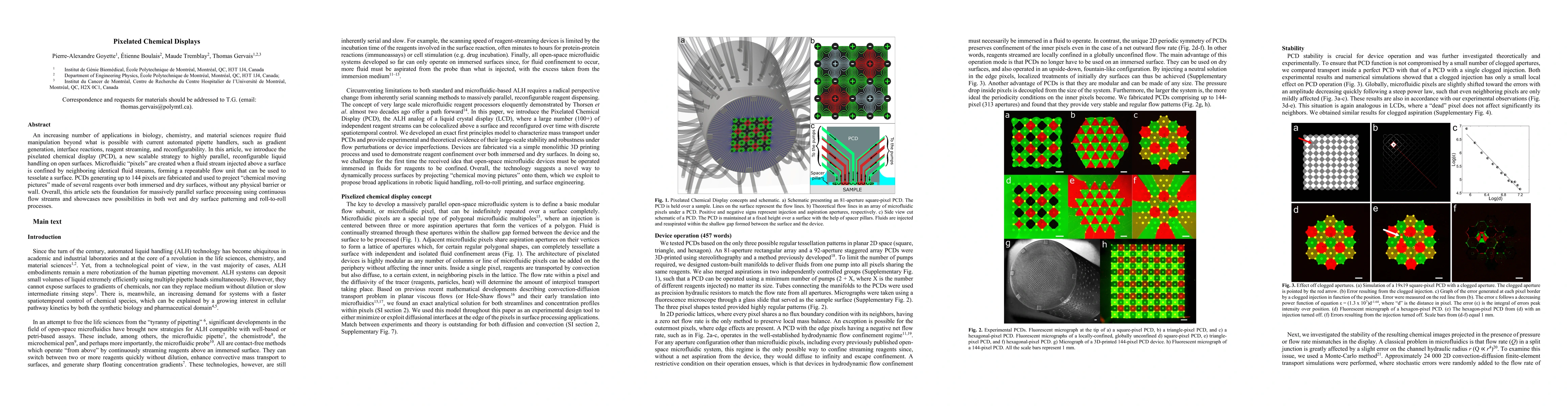 An increasing number of applications in biology, chemistry, and material sciences require fluid manipulation beyond what is possible with current automated pipette handlers, such as gradient generation, interface reactions, reagent streaming, and reconfigurability. In this article, we introduce the pixelated chemical display (PCD), a new scalable strategy to highly parallel, reconfigurable liquid handling on open surfaces. Microfluidic pixels are created when a fluid stream injected above a surface is confined by neighboring identical fluid streams, forming a repeatable flow unit that can be used to tesselate a surface. PCDs generating up to 144 pixels are fabricated and used to project chemical moving pictures made of several reagents over both immersed and dry surfaces, without any physical barrier or wall. Overall, this article sets the foundation for massively parallel surface processing using continuous flow streams and showcases new possibilities in both wet and dry surface patterning and roll-to-roll processes.