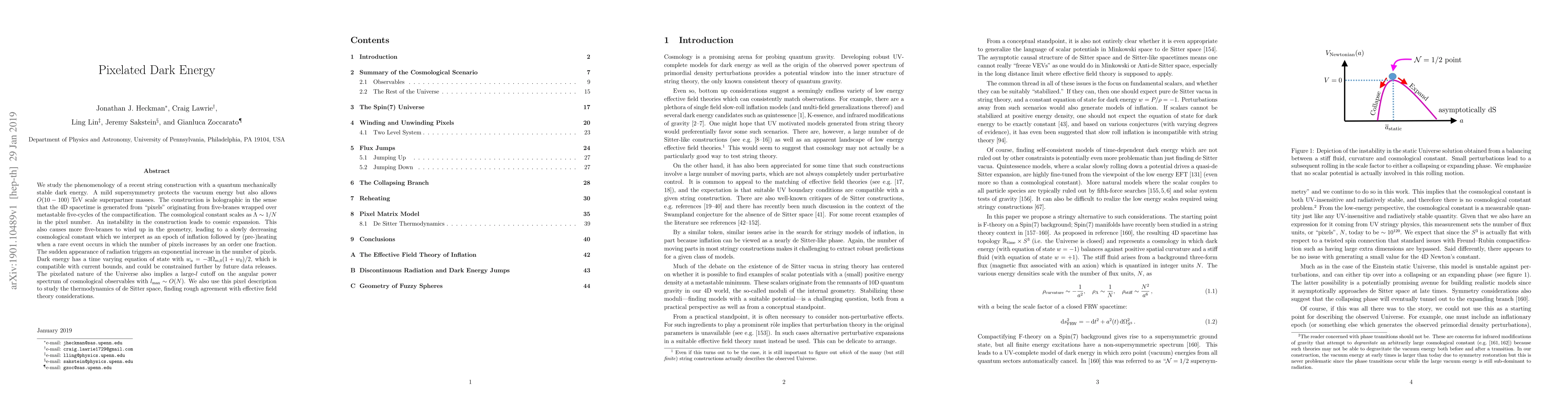 We study the phenomenology of a recent string construction with a quantum mechanically stable dark energy. A mild supersymmetry protects the vacuum energy but also allows $O(10 - 100)$ TeV scale superpartner masses. The construction is holographic in the sense that the 4D spacetime is generated from "pixels" originating from five-branes wrapped over metastable five-cycles of the compactification. The cosmological constant scales as $\Lambda \sim 1/N$ in the pixel number. An instability in the construction leads to cosmic expansion. This also causes more five-branes to wind up in the geometry, leading to a slowly decreasing cosmological constant which we interpret as an epoch of inflation followed by (pre-)heating when a rare event occurs in which the number of pixels increases by an order one fraction. The sudden appearance of radiation triggers an exponential increase in the number of pixels. Dark energy has a time varying equation of state with $w_a=-3\Omega_{m,0}(1+w_0)/2$, which is compatible with current bounds, and could be constrained further by future data releases. The pixelated nature of the Universe also implies a large-$l$ cutoff on the angular power spectrum of cosmological observables with $l_{\rm max} \sim O(N)$. We also use this pixel description to study the thermodynamics of de Sitter space, finding rough agreement with effective field theory considerations.