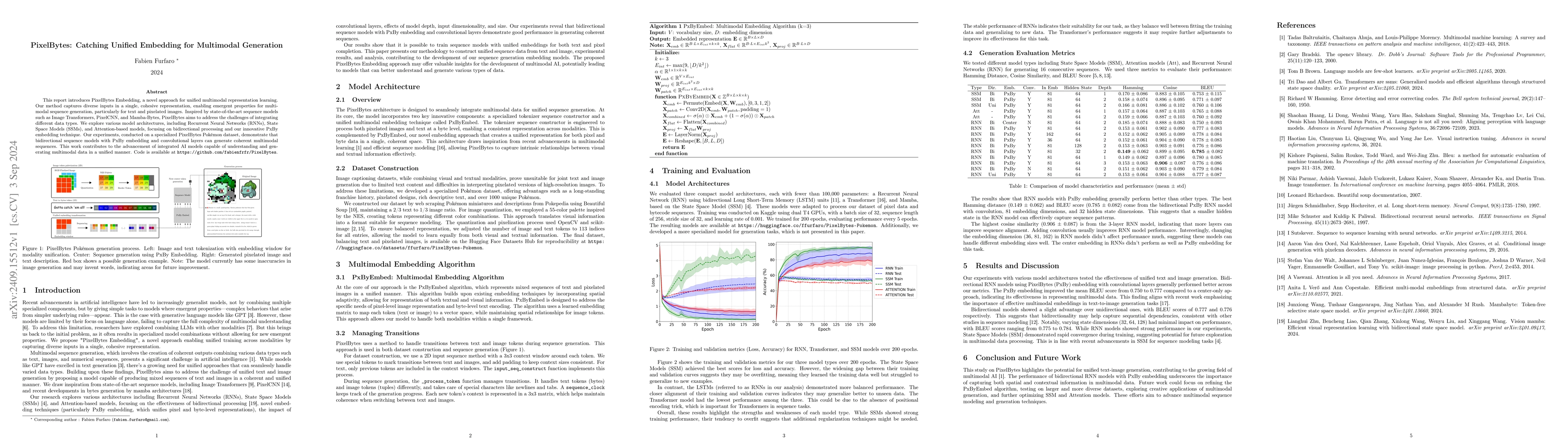 This report introduces PixelBytes Embedding, a novel approach for unified multimodal representation learning. Our method captures diverse inputs in a single, cohesive representation, enabling emergent properties for multimodal sequence generation, particularly for text and pixelated images. Inspired by state-of-the-art sequence models such as Image Transformers, PixelCNN, and Mamba-Bytes, PixelBytes aims to address the challenges of integrating different data types. We explore various model architectures, including Recurrent Neural Networks (RNNs), State Space Models (SSMs), and Attention-based models, focusing on bidirectional processing and our innovative PxBy embedding technique. Our experiments, conducted on a specialized PixelBytes Pok{\'e}mon dataset, demonstrate that bidirectional sequence models with PxBy embedding and convolutional layers can generate coherent multimodal sequences. This work contributes to the advancement of integrated AI models capable of understanding and generating multimodal data in a unified manner.