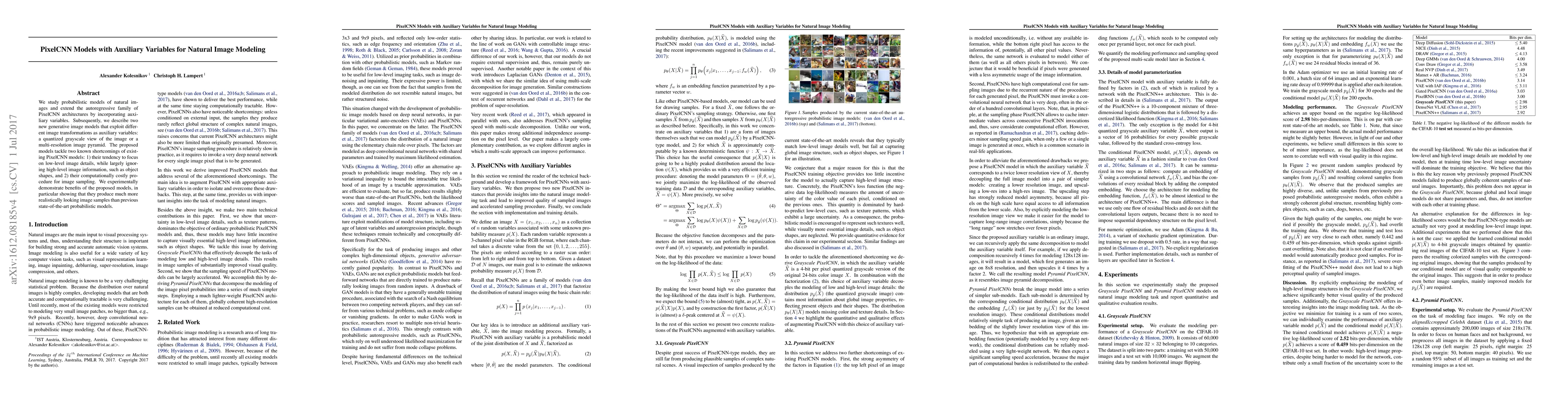 This paper introduces enhanced PixelCNN models that incorporate auxiliary variables, specifically quantized grayscale views or multi-resolution pyramids, to address the shortcomings of existing models in capturing high-level image information and reducing computational costs during sampling. Experimental results show these new models generate more realistic images compared to previous approaches.