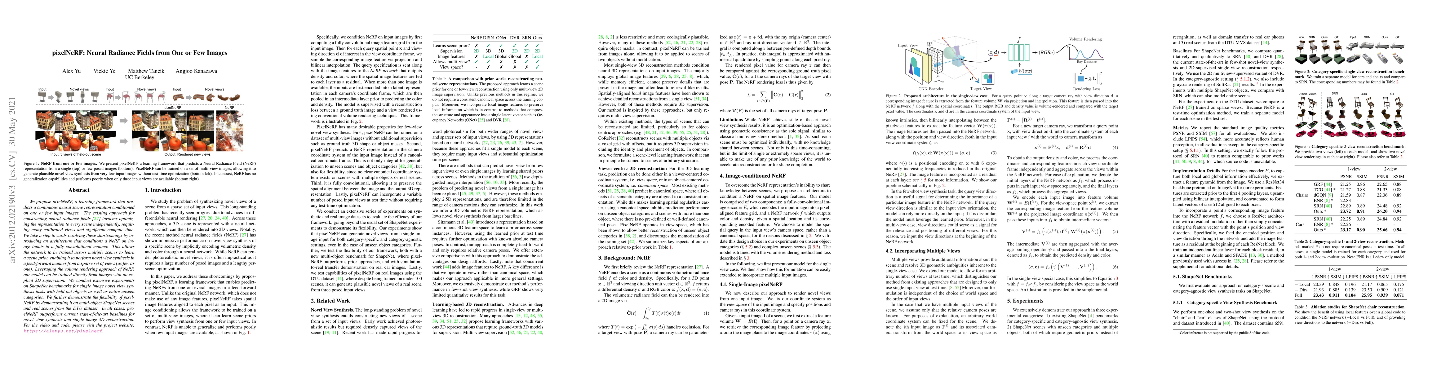 PixelNeRF introduces a learning framework for predicting neural radiance fields from one or few images, enabling novel view synthesis with fewer input views and less compute time compared to traditional methods. The model outperforms current state-of-the-art baselines in single image novel view synthesis and 3D reconstruction tasks.