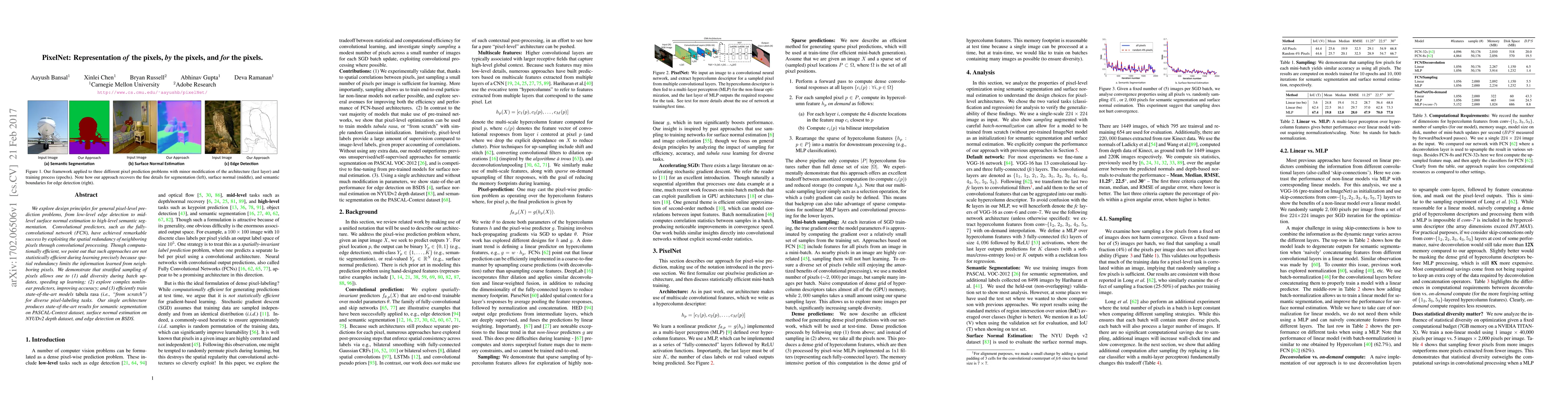 The paper proposes PixelNet, a pixel-level prediction model that improves learning efficiency by stratified pixel sampling, enabling faster learning and higher accuracy for tasks like semantic segmentation, surface normal estimation, and edge detection. PixelNet outperforms existing methods on benchmark datasets.