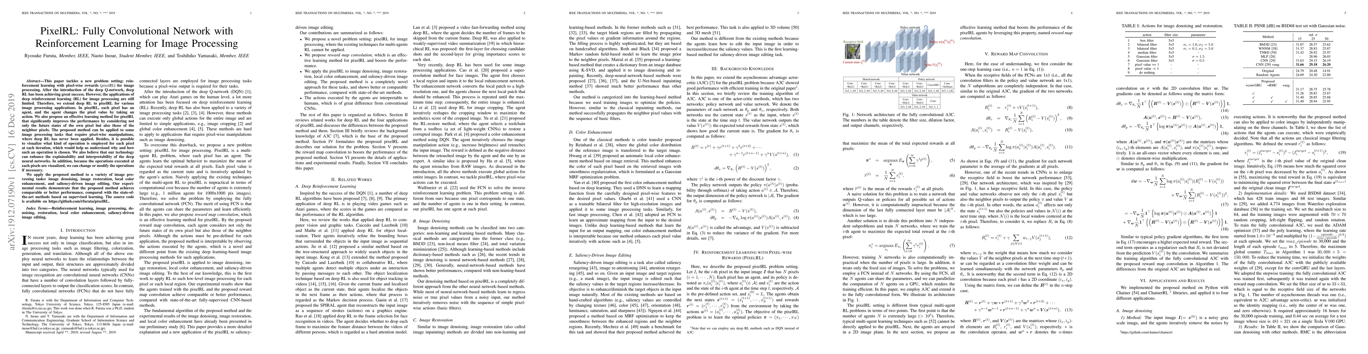 PixelRL introduces a fully convolutional network with reinforcement learning for pixel-wise image processing tasks, enabling each pixel to act as an agent that optimizes its value through actions. The method enhances performance by considering both the pixel and its neighbors' future states, achieving competitive results in image denoising, restoration, and other manipulations.
