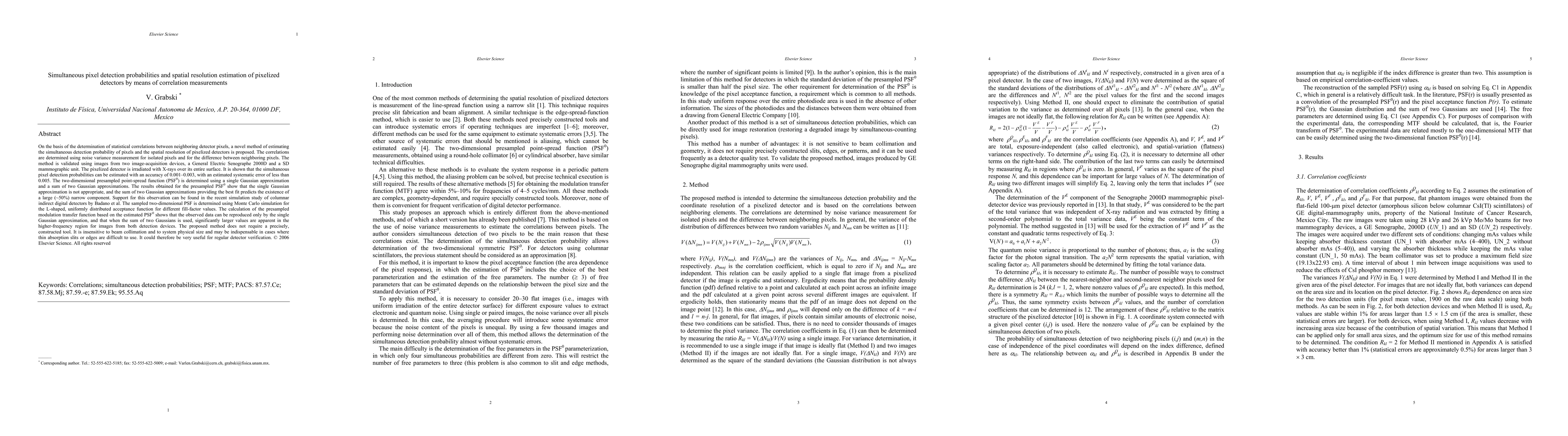 A novel method to estimate the pixels simultaneous detection probability and the spatial resolution of pixelized detectors is proposed, which is based on the determination of the statistical correlations between detector neighbor pixels. The correlations are determined by means of noise variance measurement for a isolated pixels and the difference between neighbor pixels. The method is validated using images from the two different GE Senographe 2000D mammographic units. The pixelized detector has been irradiated using x-rays along its entire surface. It is shown that the pixel simultaneous detection probabilities can be estimated within accuracy 0.001 - 0.003, where the systematic error is estimated to be smaller than 0.005. The presampled two-dimensional point-spread function (PSF0) is determined using a single Gaussian and a sum of two Gaussian approximations. The obtained results for the presampled PSF0 show that the single Gaussian approximation is not appropriate, and the sum of two Gaussian approximations providing the best fit predicts the existence of a large (~50%) narrow component. Another proof of this fact is the latest simulation study of columnar indirect digital detectors by A. Badano et al. The sampled two-dimensional PSF is determined using Monte Carlo simulation for the L-shape uniform distributed acceptance function for different values of fill factors. The detector spatial resolution is estimated using sampled PSF and has values 54 and 58 mkm for two different units. The calculation of the presampled modulation transfer function based on the PSF0 estimation shows that the existing data can only be reproduced using a single Gaussian approximation and the usage of the sum of two Gaussian show significantly larger values in the higher frequency region for both units.