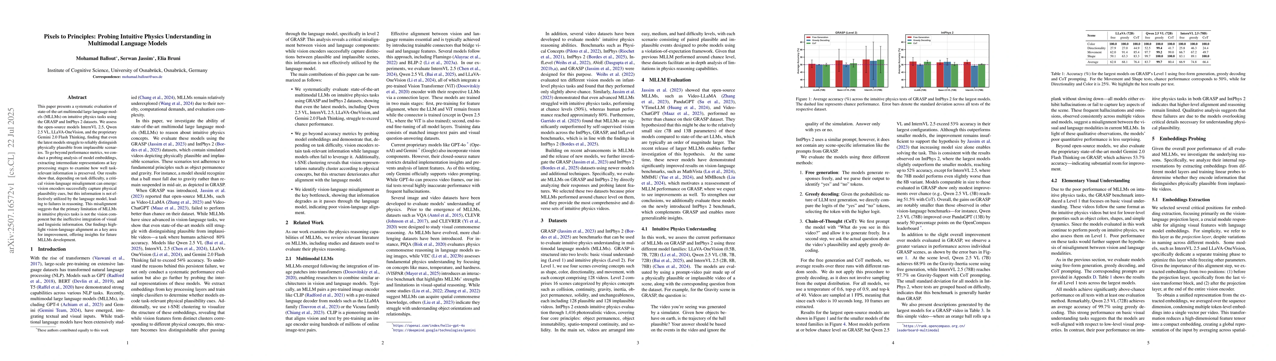 This paper presents a systematic evaluation of state-of-the-art multimodal large language models (MLLMs) on intuitive physics tasks using the GRASP and IntPhys 2 datasets. We assess the open-source models InternVL 2.5, Qwen 2.5 VL, LLaVA-OneVision, and the proprietary Gemini 2.0 Flash Thinking, finding that even the latest models struggle to reliably distinguish physically plausible from implausible scenarios. To go beyond performance metrics, we conduct a probing analysis of model embeddings, extracting intermediate representations at key processing stages to examine how well task-relevant information is preserved. Our results show that, depending on task difficulty, a critical vision-language misalignment can emerge: vision encoders successfully capture physical plausibility cues, but this information is not effectively utilized by the language model, leading to failures in reasoning. This misalignment suggests that the primary limitation of MLLMs in intuitive physics tasks is not the vision component but the ineffective integration of visual and linguistic information. Our findings highlight vision-language alignment as a key area for improvement, offering insights for future MLLMs development.