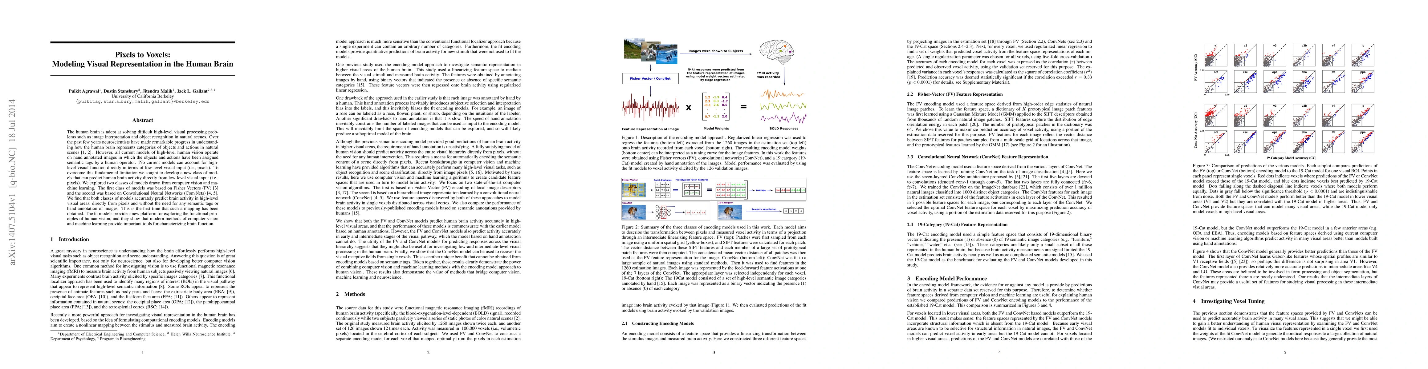 This paper develops models based on Fisher Vectors and Convolutional Neural Networks to predict human brain activity directly from low-level visual input (pixels), without requiring semantic tags or image annotations. Both models accurately predict brain activity in high-level visual areas, offering a new platform for exploring the functional principles of human vision.