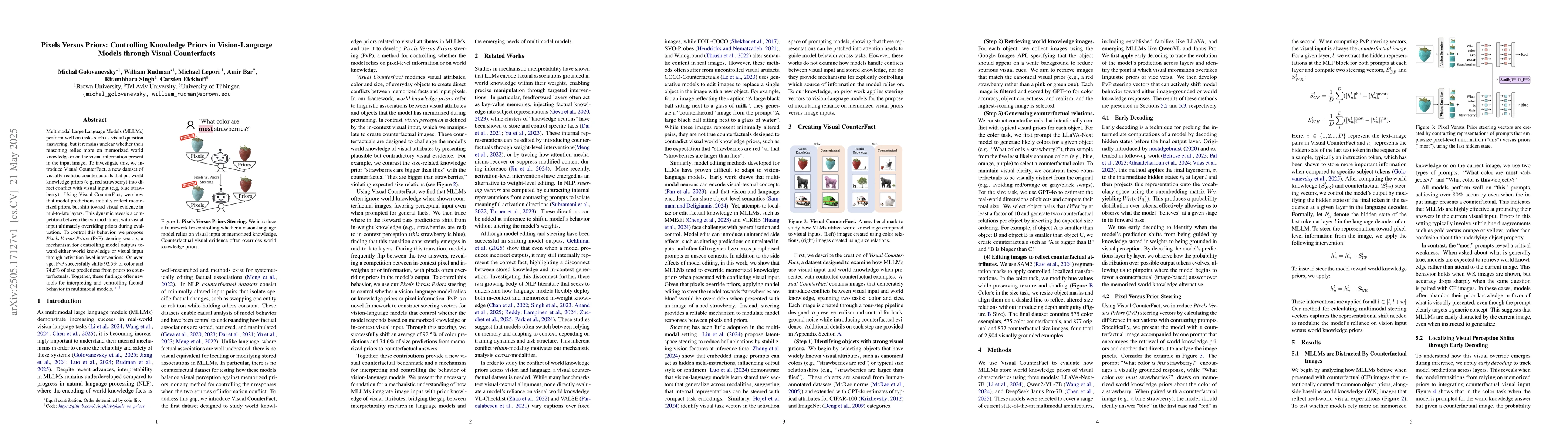 Researchers introduced Visual CounterFact to test whether multimodal LLMs rely on memorized knowledge or visual input. They found that model predictions shift towards visual evidence over time, and proposed Pixels Versus Priors steering vectors to control this behavior.