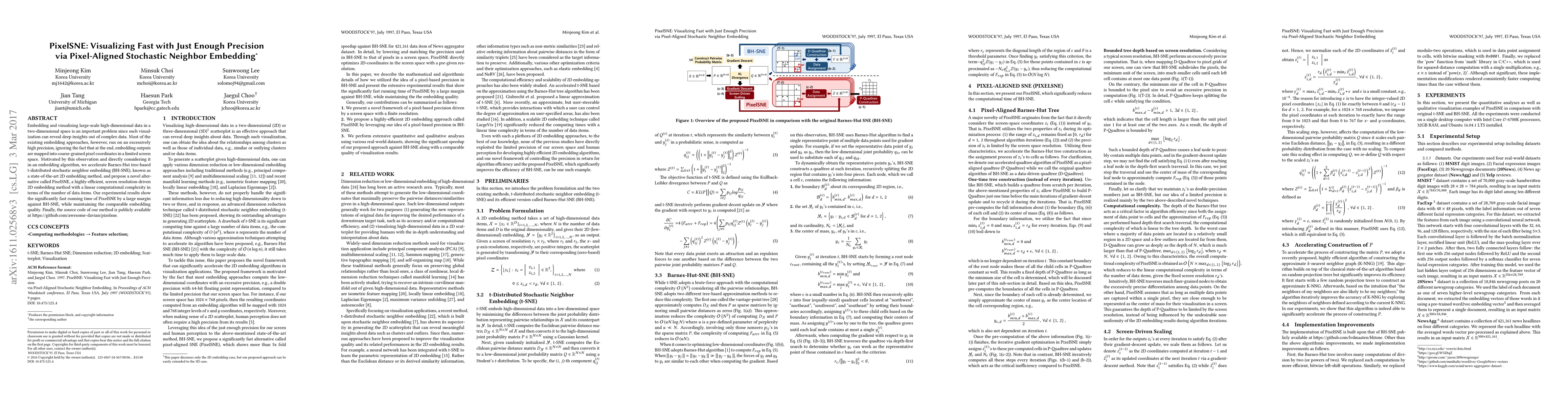 PixelSNE accelerates 2D embedding of high-dimensional data by optimizing for pixel coordinates, achieving linear complexity and significantly faster performance compared to BH-SNE while maintaining minimal loss of quality. The method is publicly available for further exploration and application.