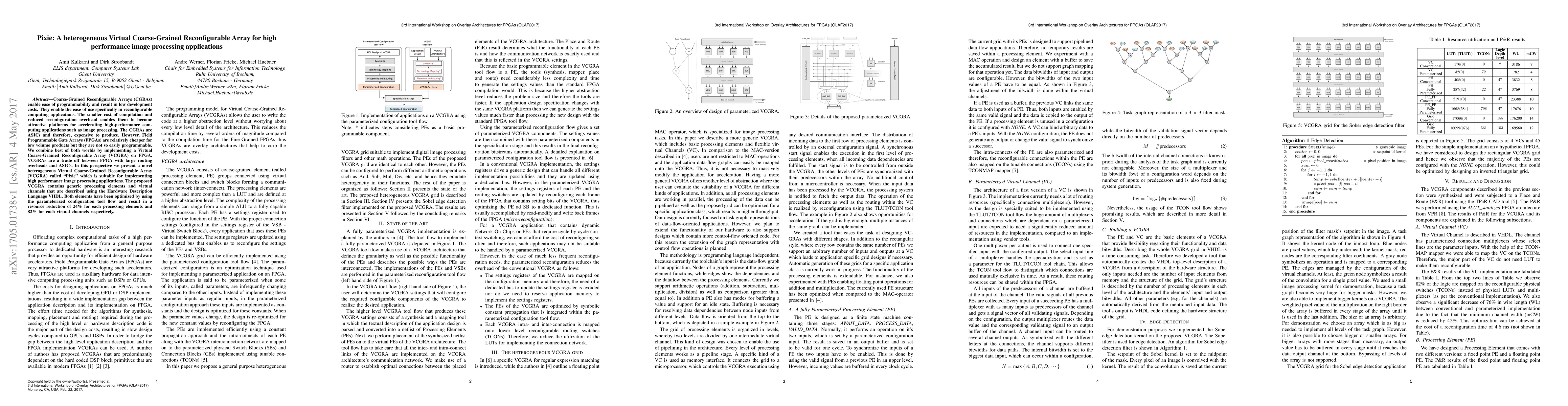 The paper introduces "Pixie," a novel heterogeneous Virtual Coarse-Grained Reconfigurable Array (VCGRA) implemented on FPGA to balance programmability and cost, optimizing resource usage by 24% for processing elements and 82% for virtual channels, aimed at high-performance image processing applications.