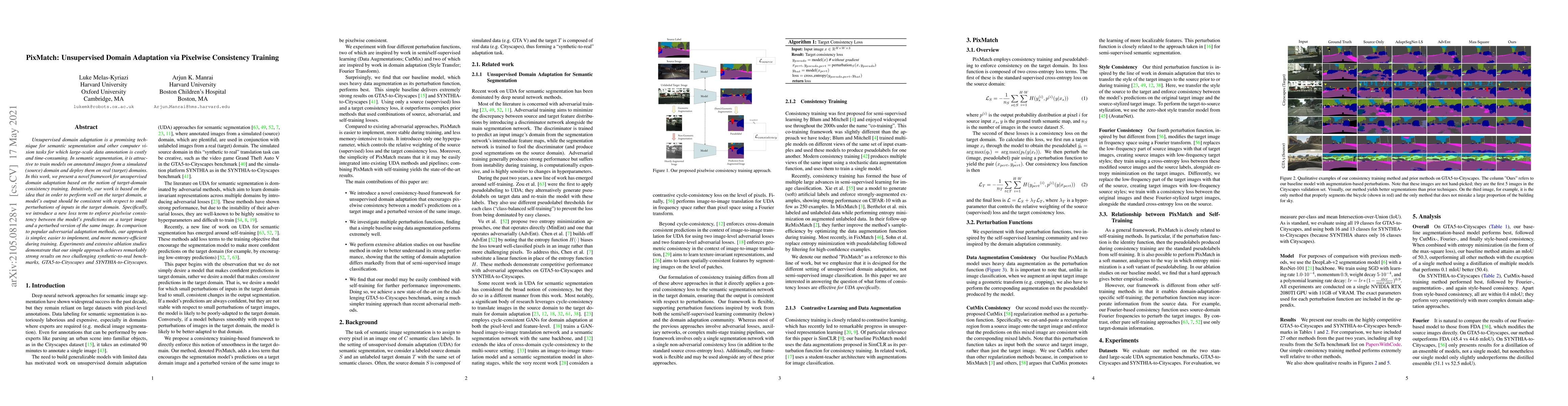 PixMatch introduces a novel unsupervised domain adaptation framework for semantic segmentation that leverages pixelwise consistency training to achieve strong results on synthetic-to-real benchmarks. Unlike adversarial methods, it is simpler, easier to implement, and more memory-efficient.