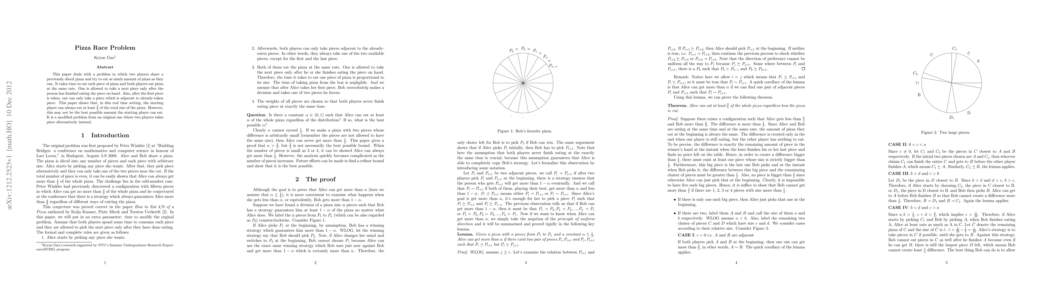 This paper deals with a problem in which two players share a previously sliced pizza and try to eat as much amount of pizza as they can. It takes time to eat each piece of pizza and both players eat pizza at the same rate. One is allowed to take a next piece only after the person has finished eating the piece on hand. Also, after the first piece is taken, one can only take a piece which is adjacent to already-taken piece. This paper shows that, in this real time setting, the starting player can always eat at least two-fifth of the total size of the pizza. However, this may not be the best possible amount the starting player can eat. It is a modified problem from an original one where two players takes piece alternatively instead.