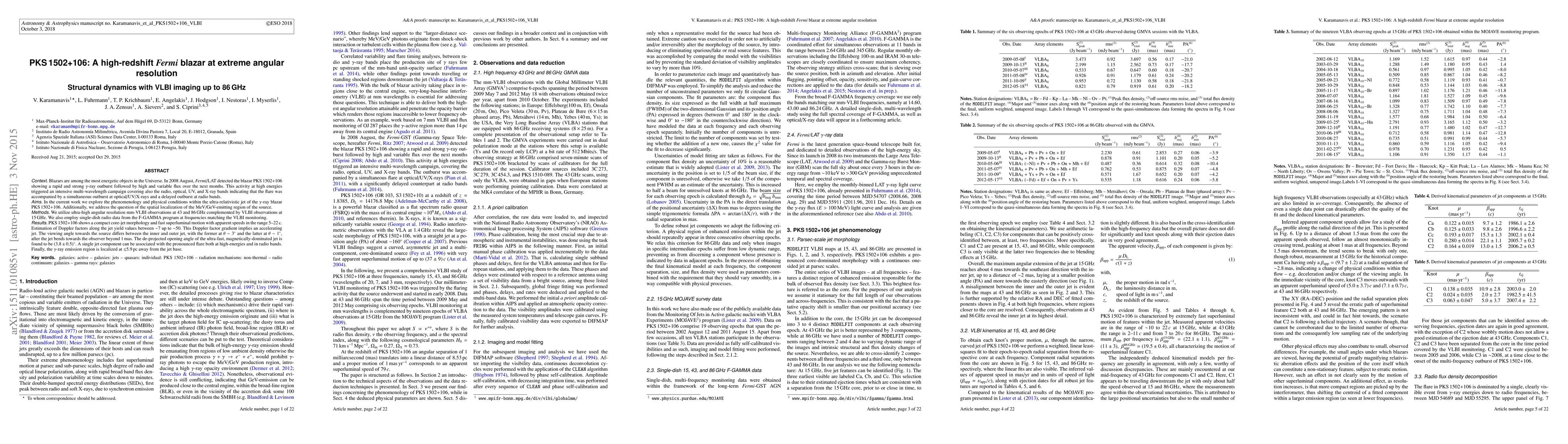 The paper studies a high-redshift Fermi blazar called PKS 1502+106 using ultra-high angular resolution observations to explore its ultra-relativistic jet's morphology, motion, and gamma-ray emission region.