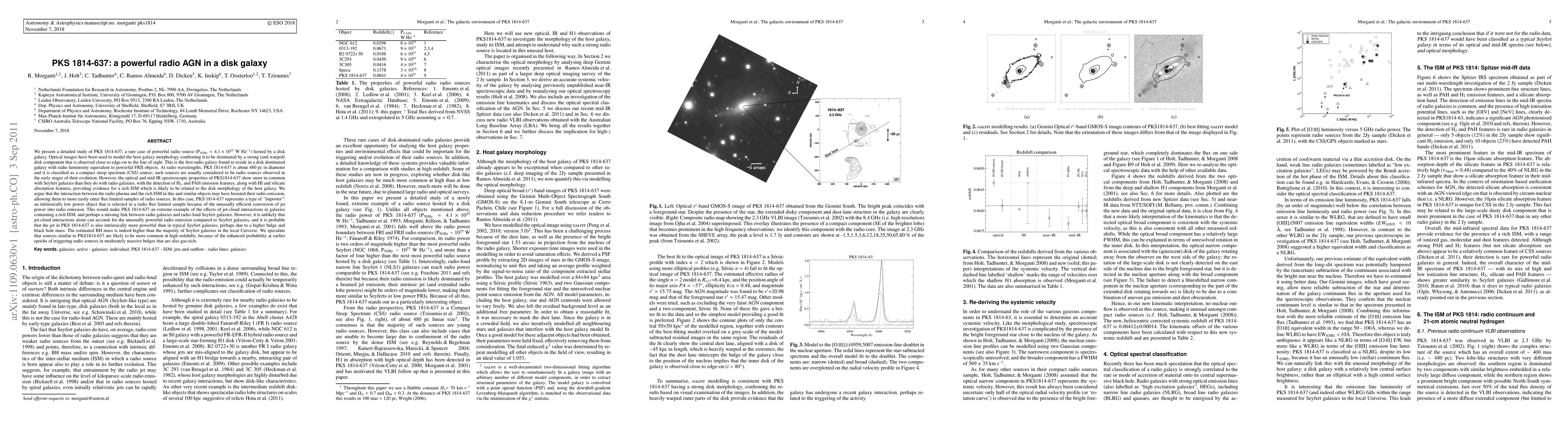 The research examines PKS 1814-637, a rare radio-loud active galactic nucleus (AGN) within a disk galaxy. Utilizing optical images, they modeled the host galaxy's morphology, revealing a warped disk observed nearly edge-on. Spectroscopic data shows the galaxy's ISM richness, with features similar to Seyfert galaxies. This suggests PKS 1814-637 might be an 'imposter' - a low-power object selected in radio flux-limited samples due to efficient jet-cloud interactions, possibly a link between radio galaxies and radio-loud Seyferts. The high estimated black hole mass further distinguishes it from typical Seyfert galaxies, and the authors speculate similar sources could be more common at high redshifts.