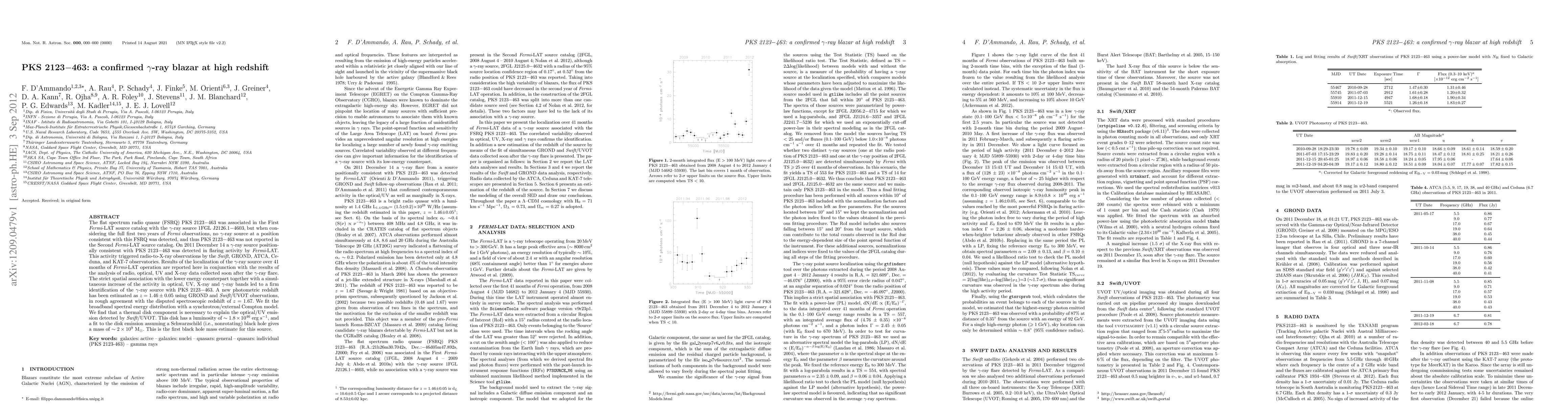 The gamma-ray blazar PKS 2123-463 is confirmed at high redshift with a mass estimate of approximately 2x10^9 solar masses and luminosity of 1.8x10^46 erg/s.