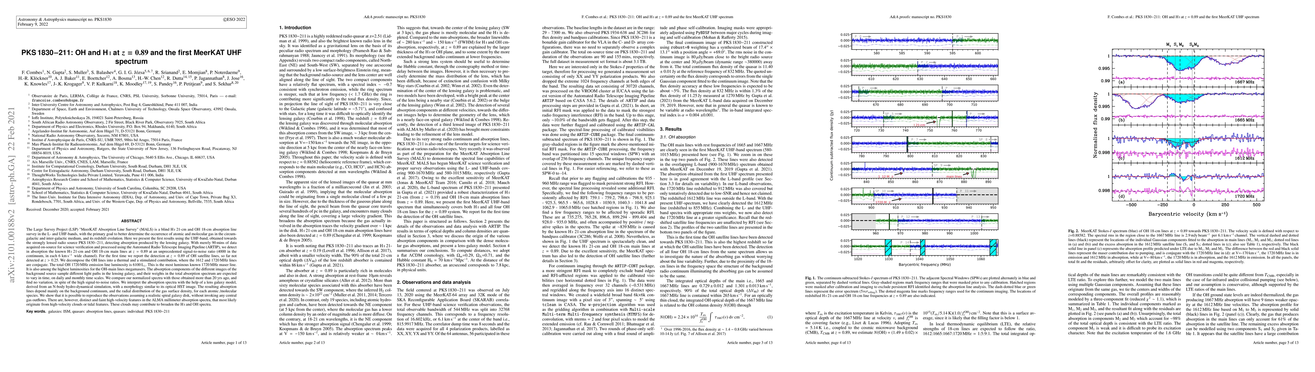 The Large Survey Project (LSP) "MeerKAT Absorption Line Survey" (MALS) is a blind HI 21-cm and OH 18-cm absorption line survey in the L- and UHF-bands, with the primary goal to better determine the occurrence of atomic and molecular gas in the circum-galactic and inter-galactic medium, and its redshift evolution. Here we present the first results using the UHF-band, obtained towards the strongly lensed radio source PKS1830, detecting absorption in the lens galaxy. With merely 90min of data acquired on-source for science verification and processed using the Automated Radio Telescope Imaging Pipeline (ARTIP), we detect in absorption the known HI 21-cm and OH 18-cm main lines at z=0.89 at an unprecedented signal-to-noise ratio (4000 in the continuum, with 6km/s channels). For the first time we report the detection at z=0.89 of OH satellite lines, so far not detected at z $>$ 0.25. We decompose the OH lines into a thermal and a stimulated contribution, where the 1612 and 1720MHz lines are conjugate. The total OH 1720MHz emission line luminosity is 6100Lsun. This is the most luminous known 1720MHz maser line. The absorption components of the different images of the background source sample different light paths in the lensing galaxy, and their weights in the total absorption spectrum are expected to vary in time, on daily and monthly time scales. We compare our normalized spectra with those obtained more than 20 yrs ago, and find no variation. We interpret the absorption spectra with the help of a lens galaxy model, derived from an N-body hydro-dynamical simulation, with a morphology similar to its optical HST image. It is possible to reproduce the observations without invoking any central gas outflows. There are, however, distinct and faint high-velocity features, most likely high-velocity clouds. These clouds may contribute to broaden the HI and OH spectra.