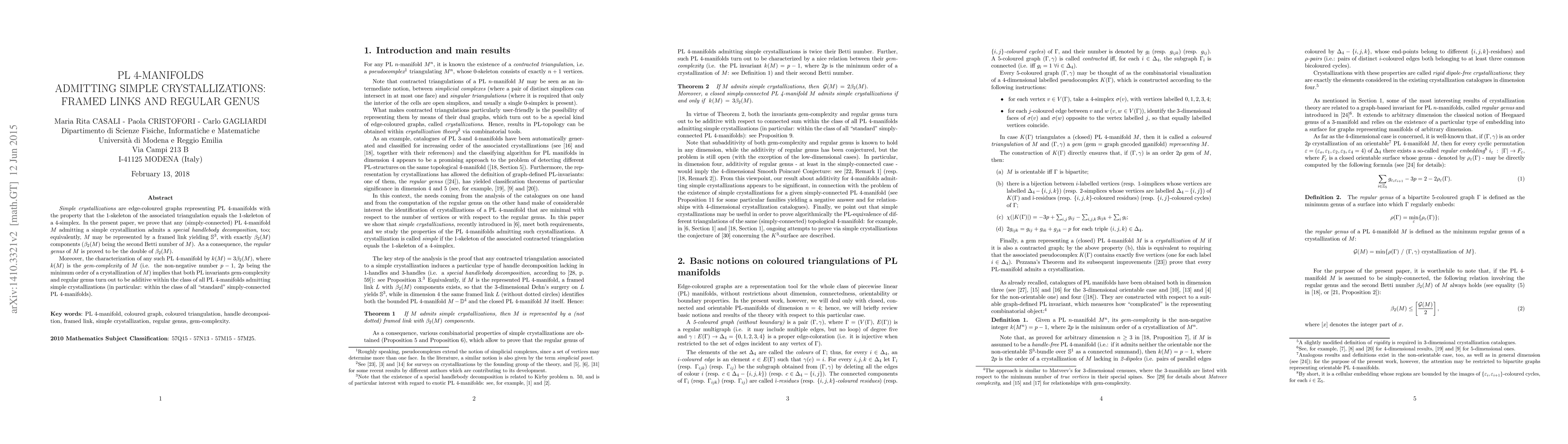 Simple crystallizations are edge-coloured graphs representing PL 4-manifolds with the property that the 1-skeleton of the associated triangulation equals the 1-skeleton of a 4-simplex. In the present paper, we prove that any (simply-connected) PL $4$-manifold $M$ admitting a simple crystallization admits a special handlebody decomposition, too; equivalently, $M$ may be represented by a framed link yielding $\mathbb S^3$, with exactly $\beta_2(M)$ components ($\beta_2(M)$ being the second Betti number of $M$). As a consequence, the regular genus of $M$ is proved to be the double of $\beta_2(M)$. Moreover, the characterization of any such PL $4$-manifold by $k(M)= 3 \beta_2(M)$, where $k(M)$ is the gem-complexity of $M$ (i.e. the non-negative number $p-1$, $2p$ being the minimum order of a crystallization of $M$) implies that both PL invariants gem-complexity and regular genus turn out to be additive within the class of all PL $4$-manifolds admitting simple crystallizations (in particular: within the class of all "standard" simply-connected PL 4-manifolds).