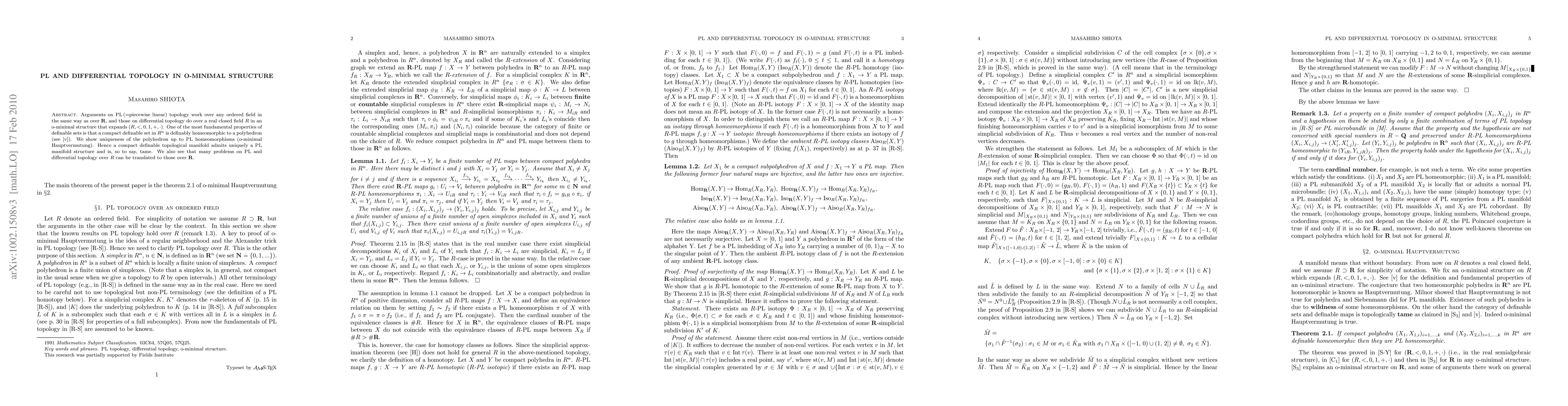 Arguments on PL,(=piecewise linear) topology work over any ordered field in the same way as over the real field, and those on differential topology do over a real closed field R in an o-minimal structure that expands (R,<,0,1,+,cdot). One of the most fundamental properties of definable sets is that a compact definable set in R^n is definably homeomorphic to a polyhedron (see [v]). We show uniqueness of the polyhedron up to PL homeomorphisms (o-minimal Hauptvermutung). Hence a compact definable topological manifold admits uniquely a PL manifold structure and is, so to say, tame. We also see that many problems on PL and differential topology over R can be translated to those over the real field.