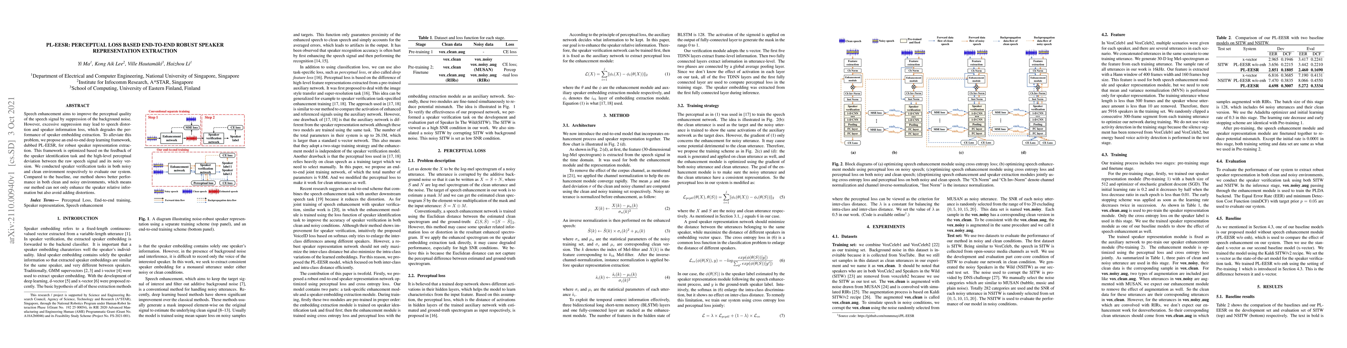 The PL-EESR framework proposes an end-to-end deep learning model for robust speaker representation extraction, optimizing it using perceptual loss and speaker identification feedback. Evaluations show improved performance in speaker verification tasks across noisy and clean environments, demonstrating enhanced speaker information without distortion.