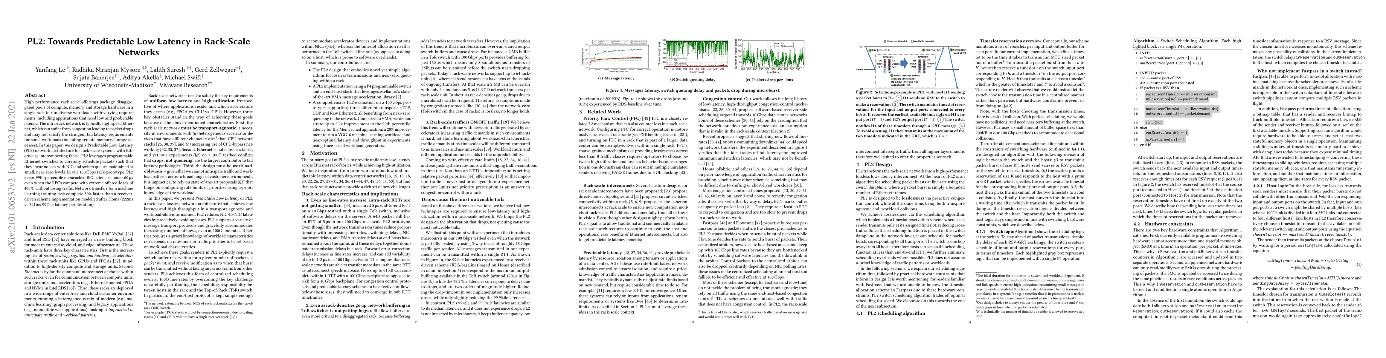 This paper proposes a Predictable Low Latency (PL2) network architecture for rack-scale systems to meet stringent latency requirements for diverse workloads. PL2 uses programmable Ethernet switches to minimize congestion and packet loss, achieving sub-60us latency for memcached RPCs even under high load conditions.