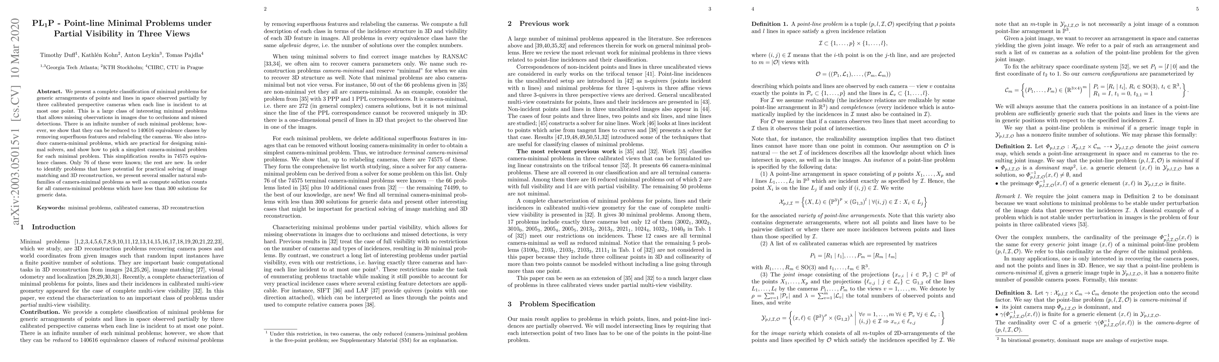 We present a complete classification of minimal problems for generic arrangements of points and lines in space observed partially by three calibrated perspective cameras when each line is incident to at most one point. This is a large class of interesting minimal problems that allows missing observations in images due to occlusions and missed detections. There is an infinite number of such minimal problems; however, we show that they can be reduced to 140616 equivalence classes by removing superfluous features and relabeling the cameras. We also introduce camera-minimal problems, which are practical for designing minimal solvers, and show how to pick a simplest camera-minimal problem for each minimal problem. This simplification results in 74575 equivalence classes. Only 76 of these were known; the rest are new. In order to identify problems that have potential for practical solving of image matching and 3D reconstruction, we present several smaller natural subfamilies of camera-minimal problems as well as compute solution counts for all camera-minimal problems which have less than 300 solutions for generic data.