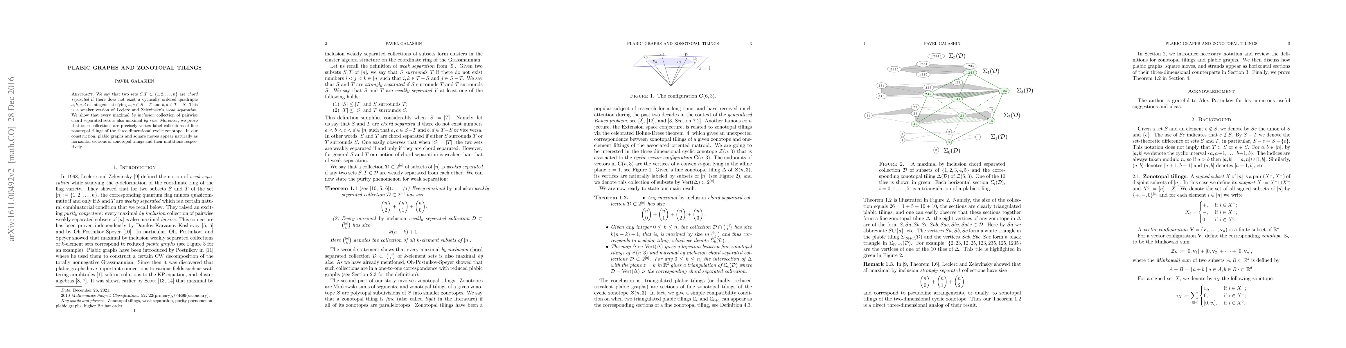 The paper establishes a connection between plabic graphs and zonotopal tilings, demonstrating that maximal by inclusion chord-separated collections of subsets correspond to vertex label collections of fine zonotopal tilings of the three-dimensional cyclic zonotope.