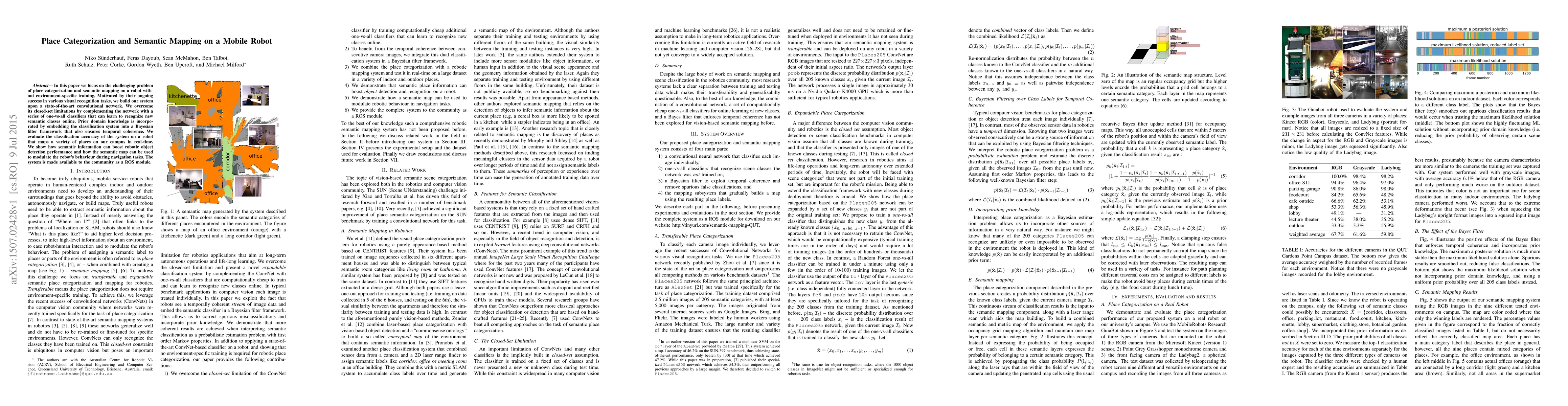 This paper presents a system for place categorization and semantic mapping on a mobile robot using a convolutional network enhanced with one-vs-all classifiers for online learning of new semantic classes. The system integrates prior knowledge via a Bayesian filter to ensure temporal coherence and real-time performance, enhancing object detection and navigation.