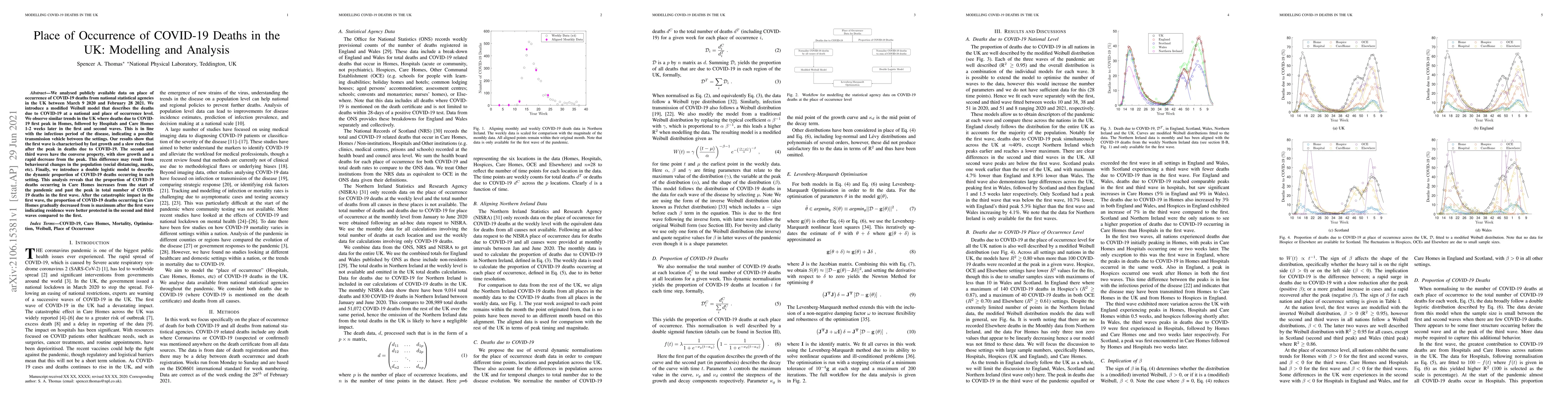 We analysed publicly available data on place of occurrence of COVID-19 deaths from national statistical agencies in the UK between March 9 2020 and February 28 2021. We introduce a modified Weibull model that describes the deaths due to COVID-19 at a national and place of occurrence level. We observe similar trends in the UK where deaths due to COVID-19 first peak in Homes, followed by Hospitals and Care Homes 1-2 weeks later in the first and second waves. This is in line with the infectious period of the disease, indicating a possible transmission vehicle between the settings. Our results show that the first wave is characterised by fast growth and a slow reduction after the peak in deaths due to COVID-19. The second and third waves have the converse property, with slow growth and a rapid decrease from the peak. This difference may result from behavioural changes in the population (social distancing, masks, etc). Finally, we introduce a double logistic model to describe the dynamic proportion of COVID-19 deaths occurring in each setting. This analysis reveals that the proportion of COVID-19 deaths occurring in Care Homes increases from the start of the pandemic and past the peak in total number of COVID-19 deaths in the first wave. After the catastrophic impact in the first wave, the proportion of COVID-19 deaths occurring in Care Homes gradually decreased from is maximum after the first wave indicating residence were better protected in the second and third waves compared to the first.