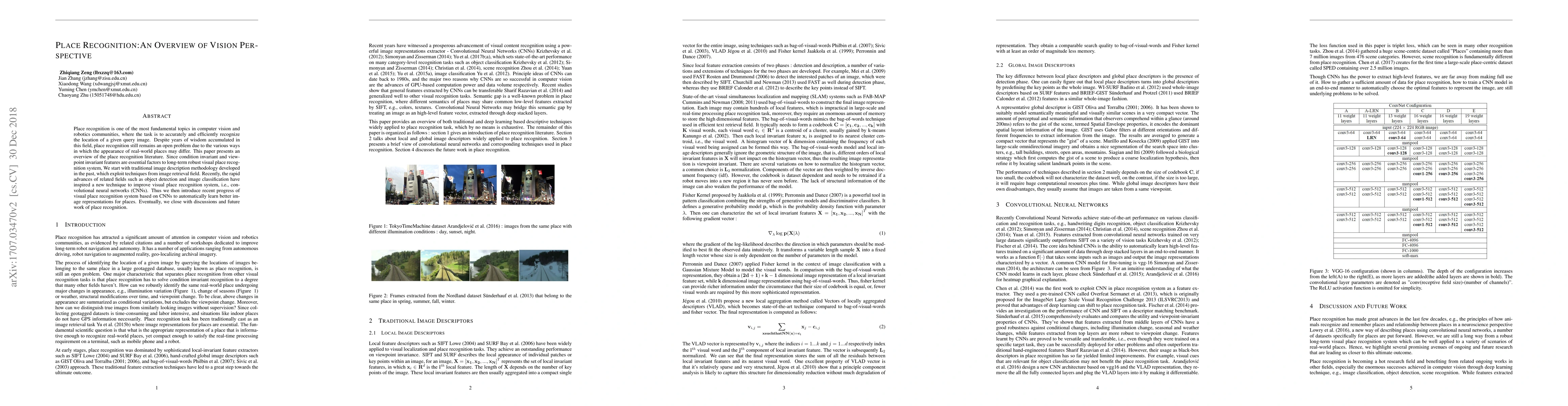 This paper provides an overview of place recognition in computer vision, focusing on traditional image description methods and recent advancements using convolutional neural networks (CNNs) to improve feature representation. It concludes with discussions on challenges and future directions.